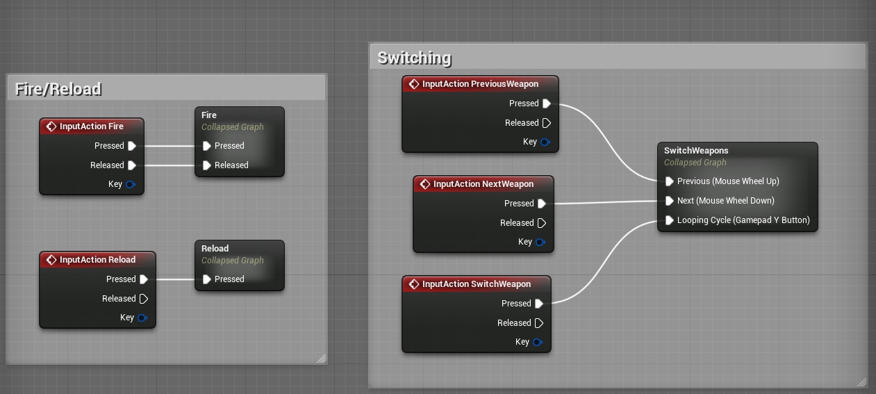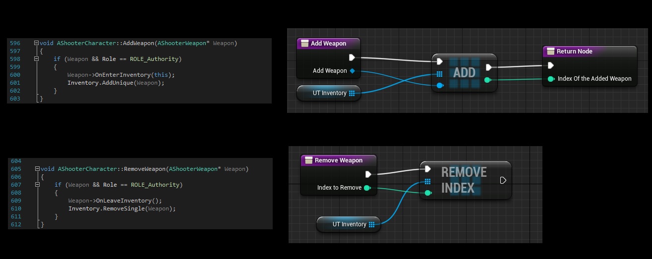 The Inventory system is similar to how it works in the ShooterGame example. Except instead of C++, it’s made using Blueprints and you can pick up new weapons, display them from the inventory widget, equip, drop or save them.