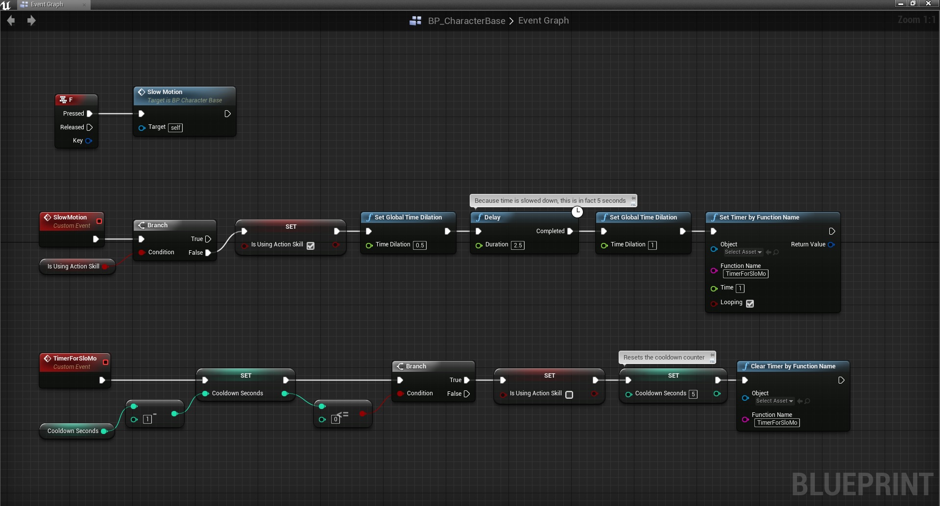 Now whenever F is pressed, the game will go into Slow Motion, after a few seconds it will go back to normal, then start a timer (cooldown) and reset the action skill.