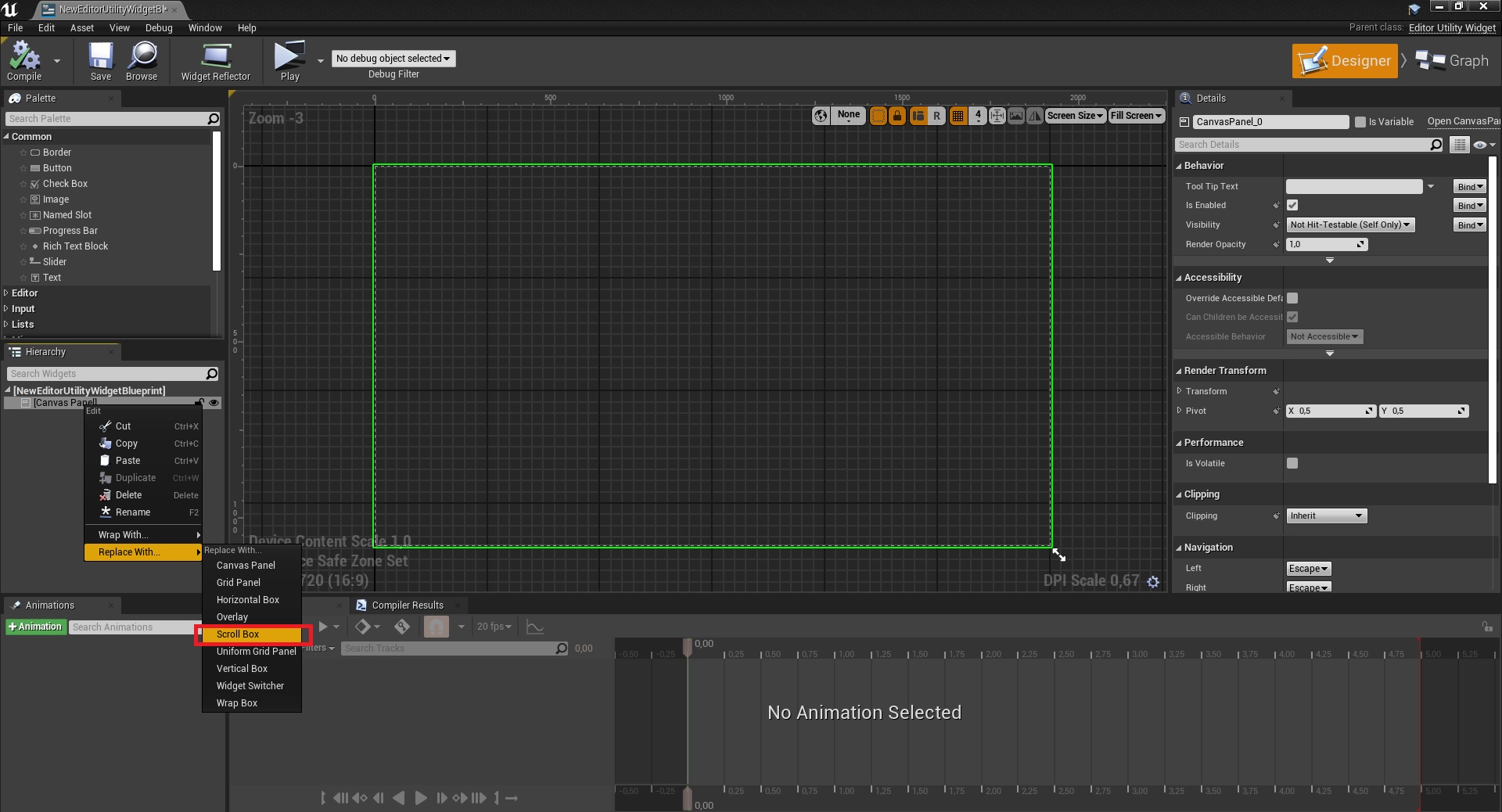 2. When you open it, at first glance it’s just like any other widget, but we want this to have like a scroll layout so that all buttons can fit, right click on the Canvas Panel > Replace With > Scroll Box