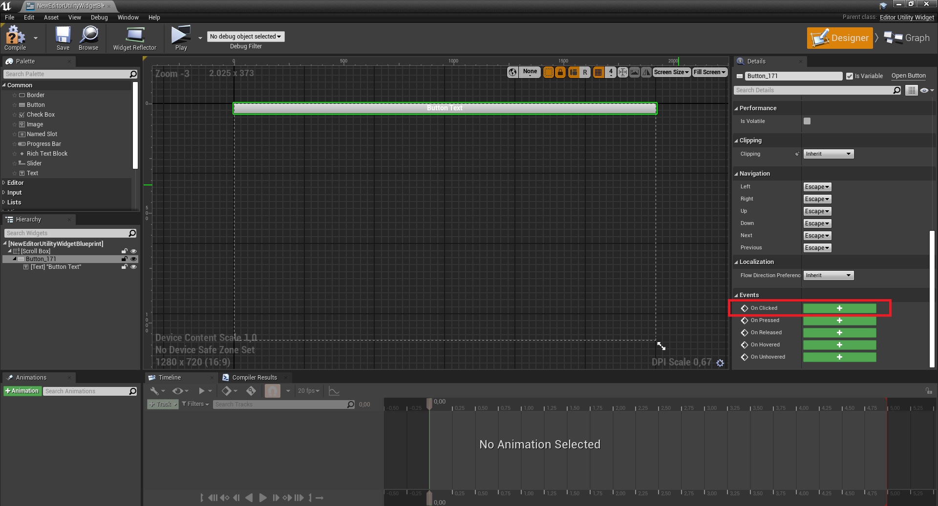 4. The only thing to be aware of is that Utility Widgets Blueprints are editor extensions, so they have the tendency to invite themselves into other projects as well, that is in the output log it might say that it attempted to load it but couldn’t find. That is a harmless warning, but there is a fix for that too, close all Utility Widget Blueprint windows and reset the layout