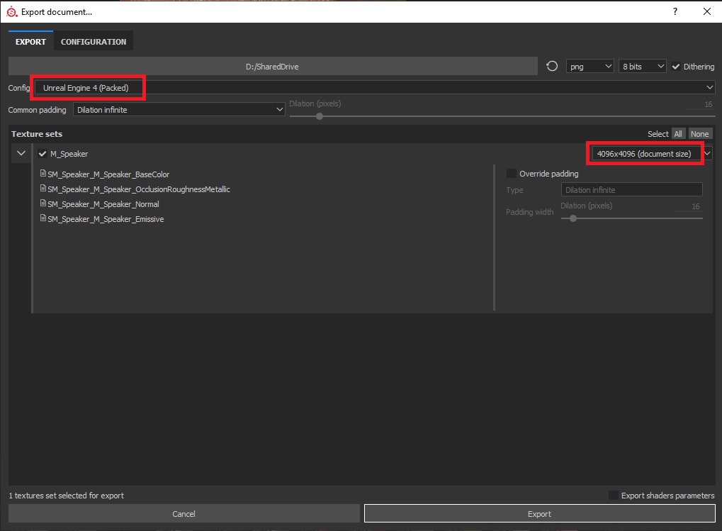 3. In the Export dialogue scroll down until you find Unreal Engine 4 Packed, set the resolution that you want (4K used in this example) and click on Export.