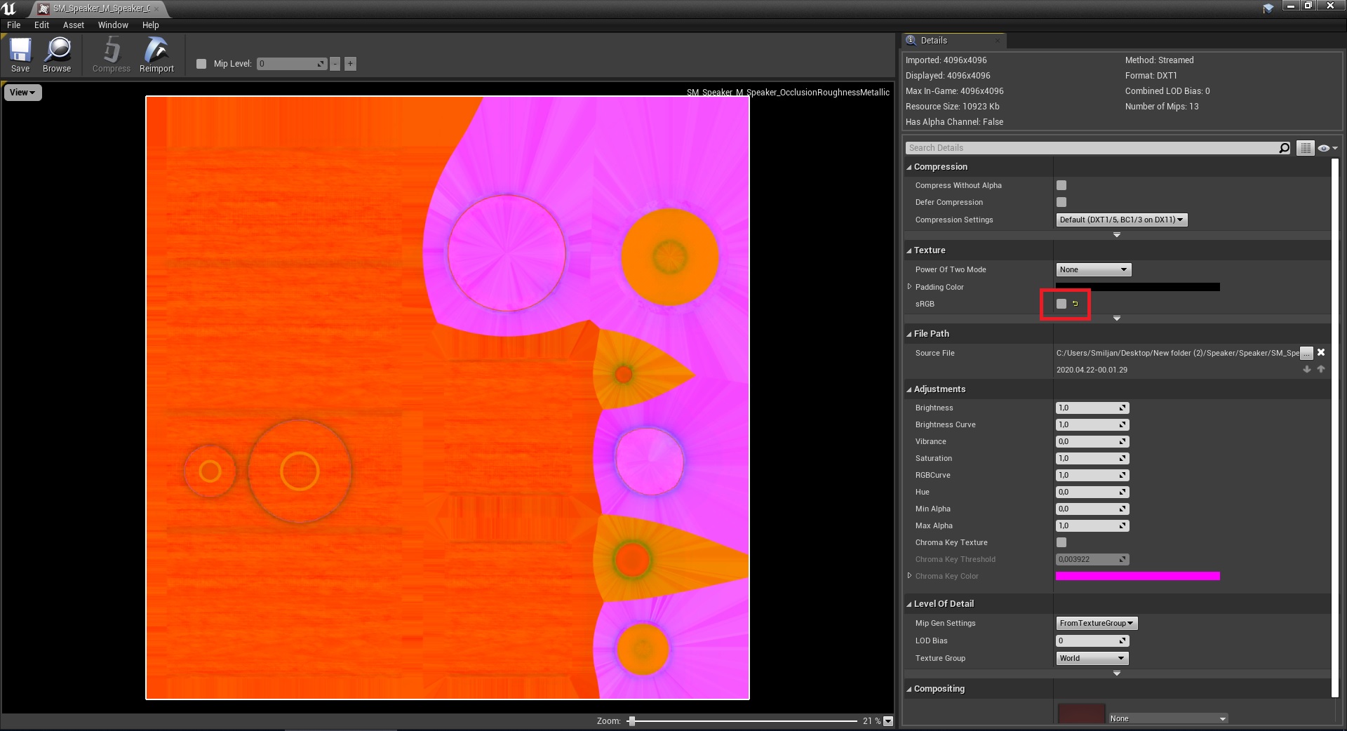 4. After that import the fbx file and the exported textures into UE4, normal map should already be recognized as such, but the other one that contains metallic, roughness and AO was not, so we need to open it and un-check sRGB on it.