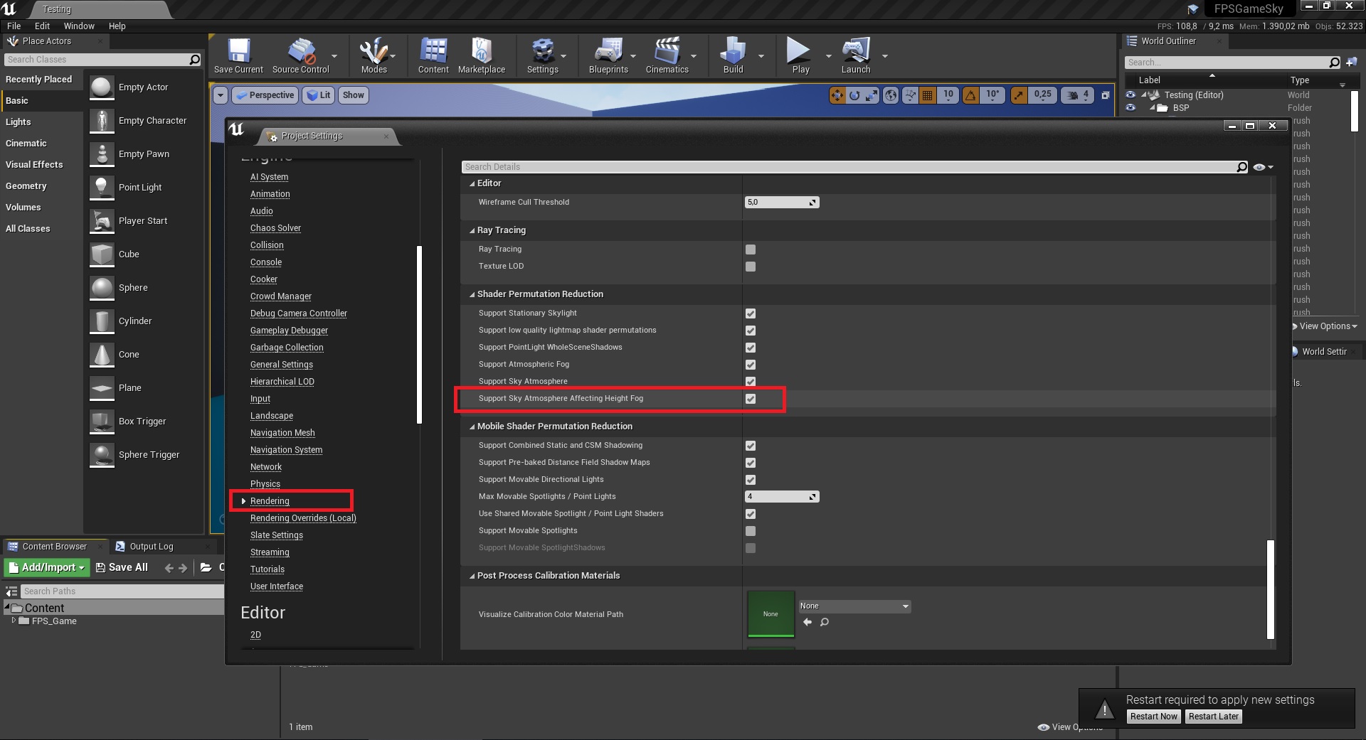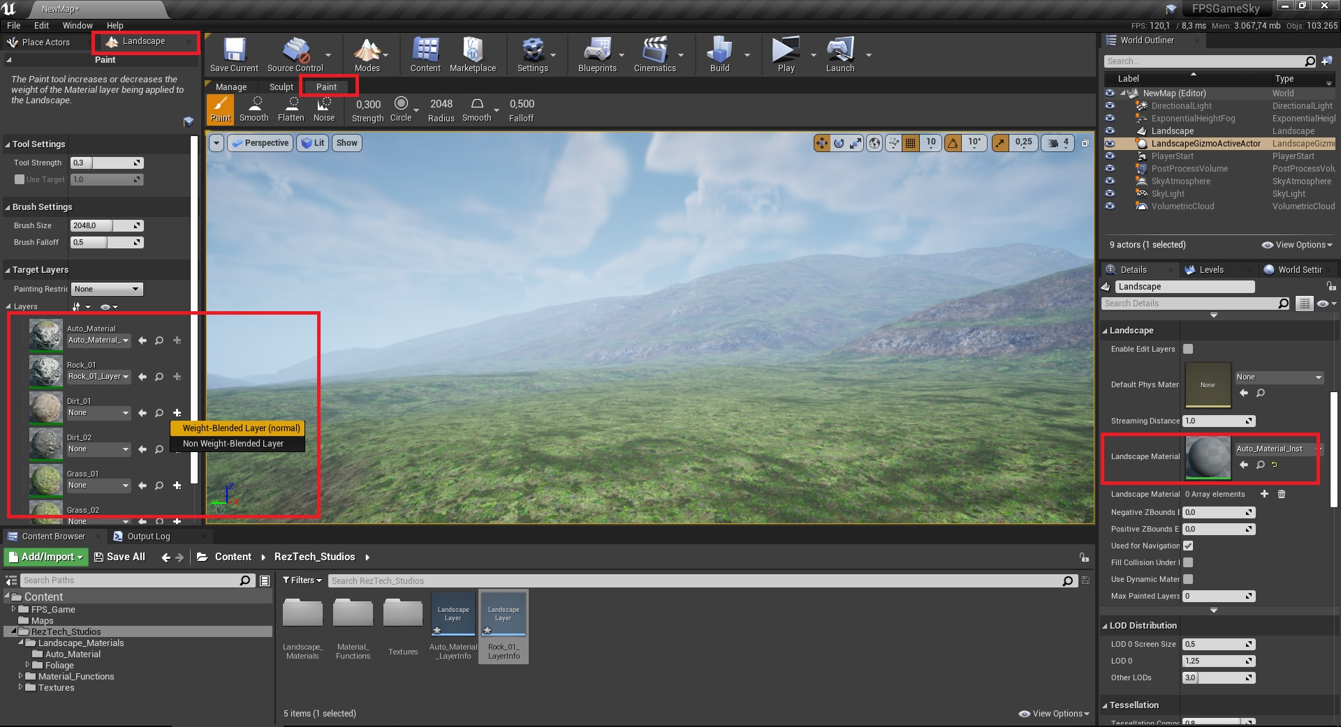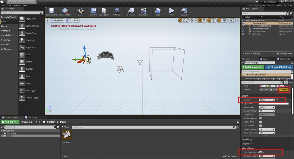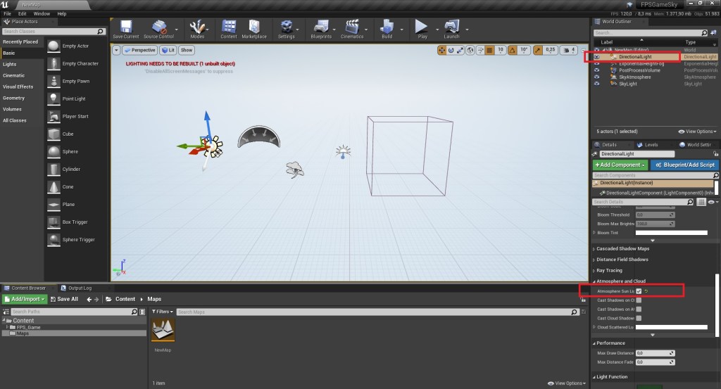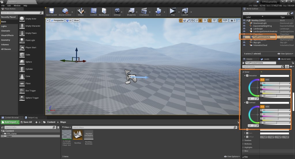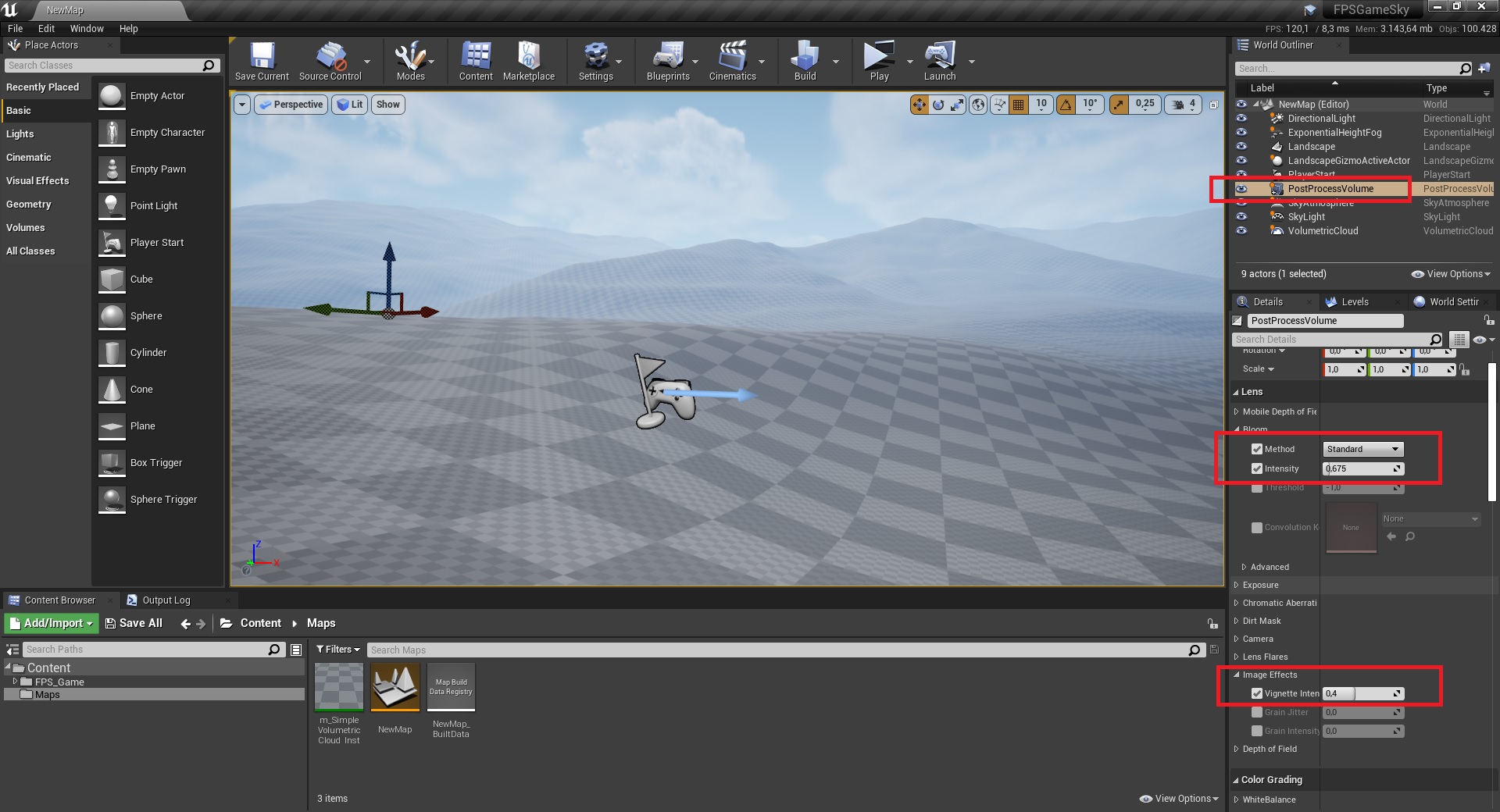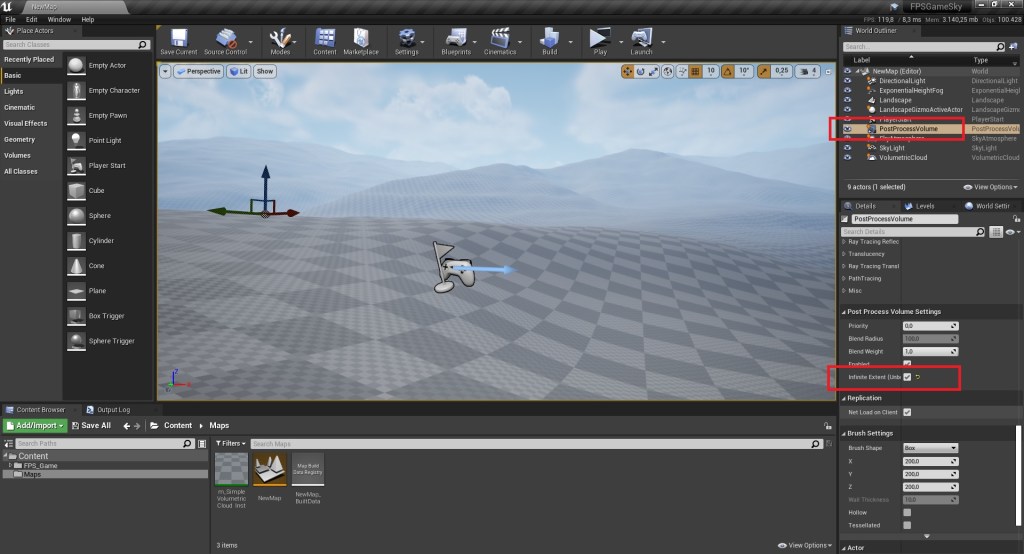 3. Add a Directional Light, Sky Light, Exponential Height Fog, Sky Atmosphere and Post Process Volume into the level.