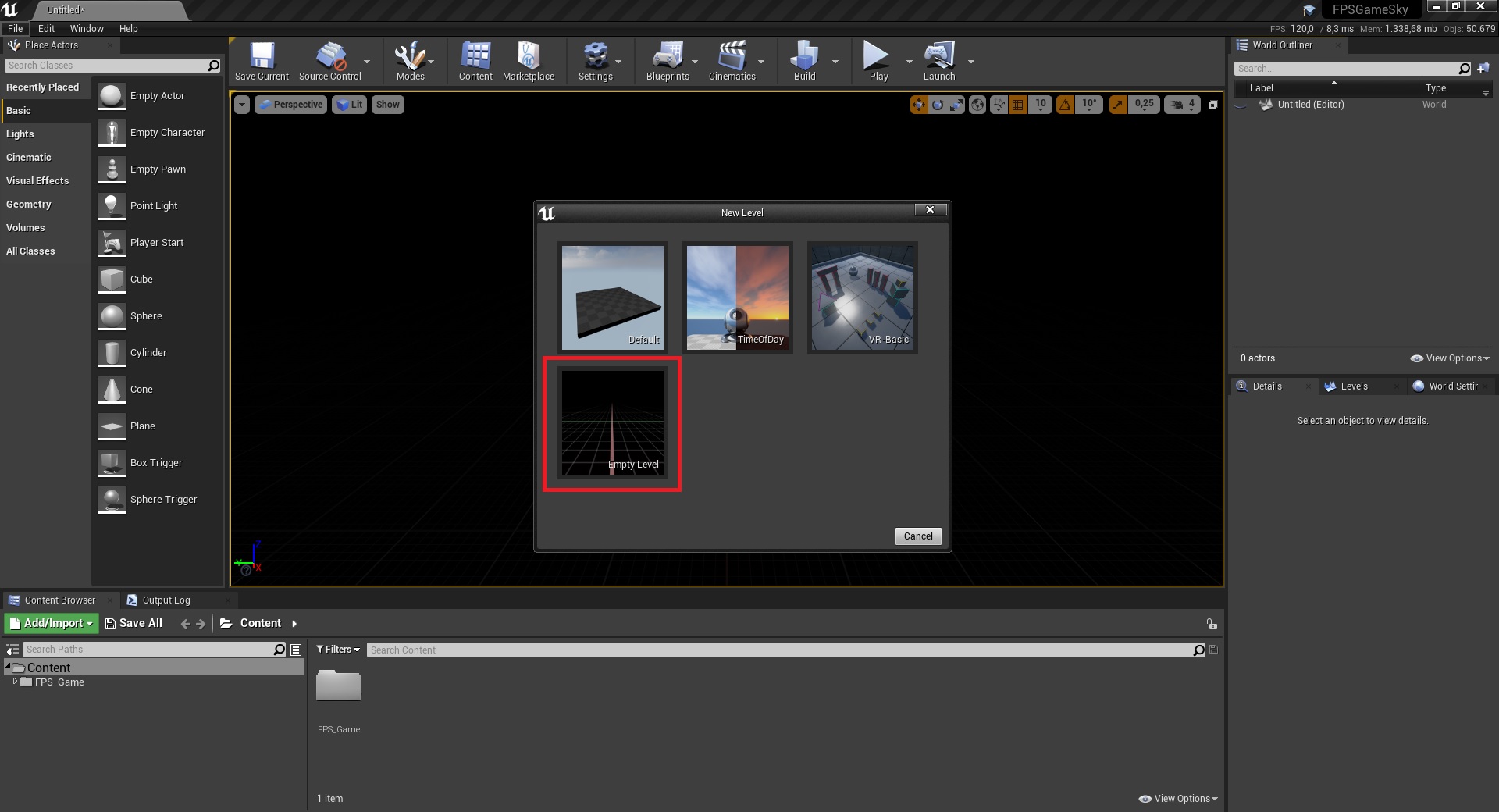 2. Create a new level, we’ll start from the blank one and add things in manually