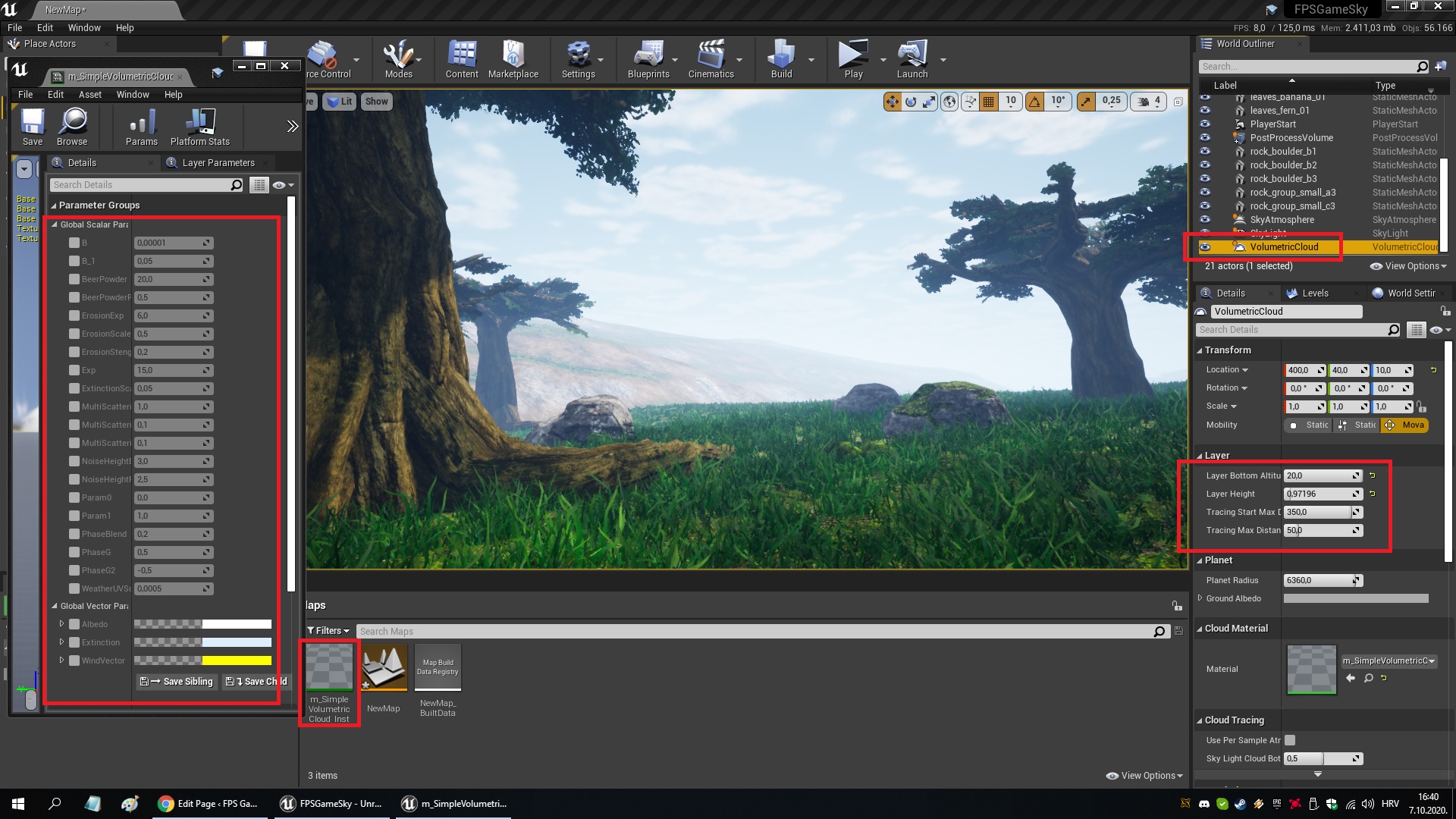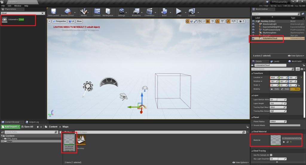 4. Add a Volumetric Cloud actor into the scene, the material instance can be downloaded here, but you can also make the Engine Content visible and search for the Volumetric Cloud material there.