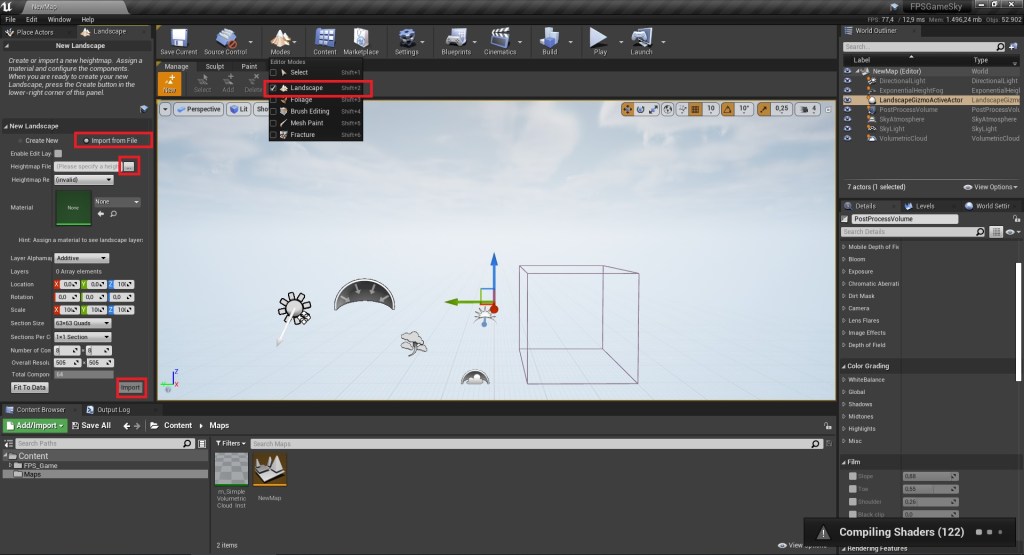 5. Switch to Landscape mode and create a new terrain by importing an existing one. This expects a heightmap png file, I prepared one in advance (download link), however you can also make your own using software like World Machine or by going to Terrain Party and find a location (click on the download link on the right side, extract the ASTER30 one from the zip file), once you have the png file, when creating a new landscape, click import from file and pick the image and click on import.