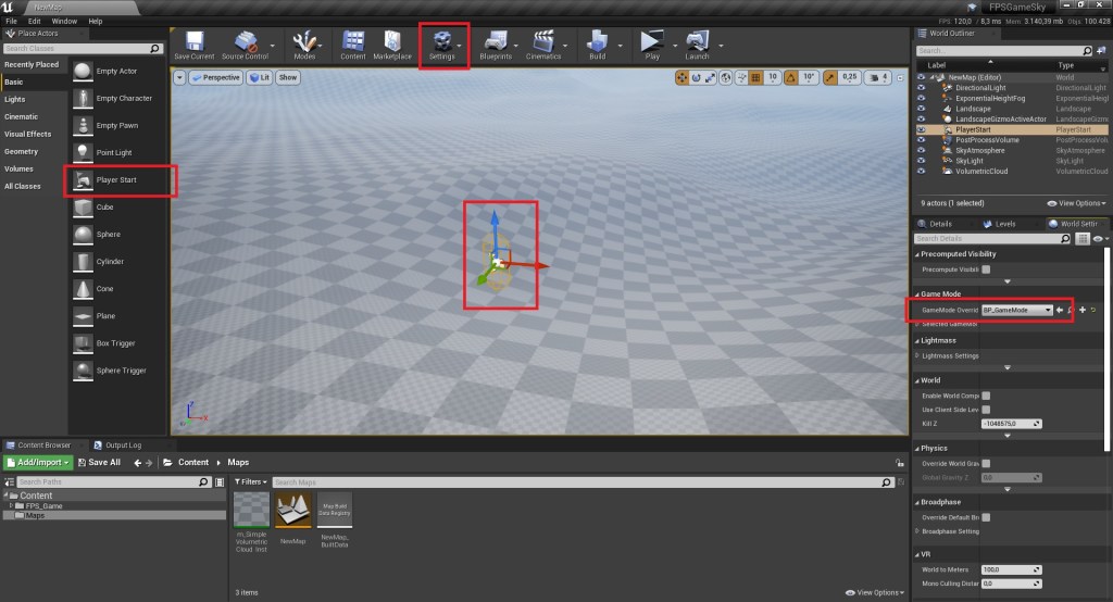 9. Place a Player Start anywhere on the map, and in World Settings set it to use BP_GameMode