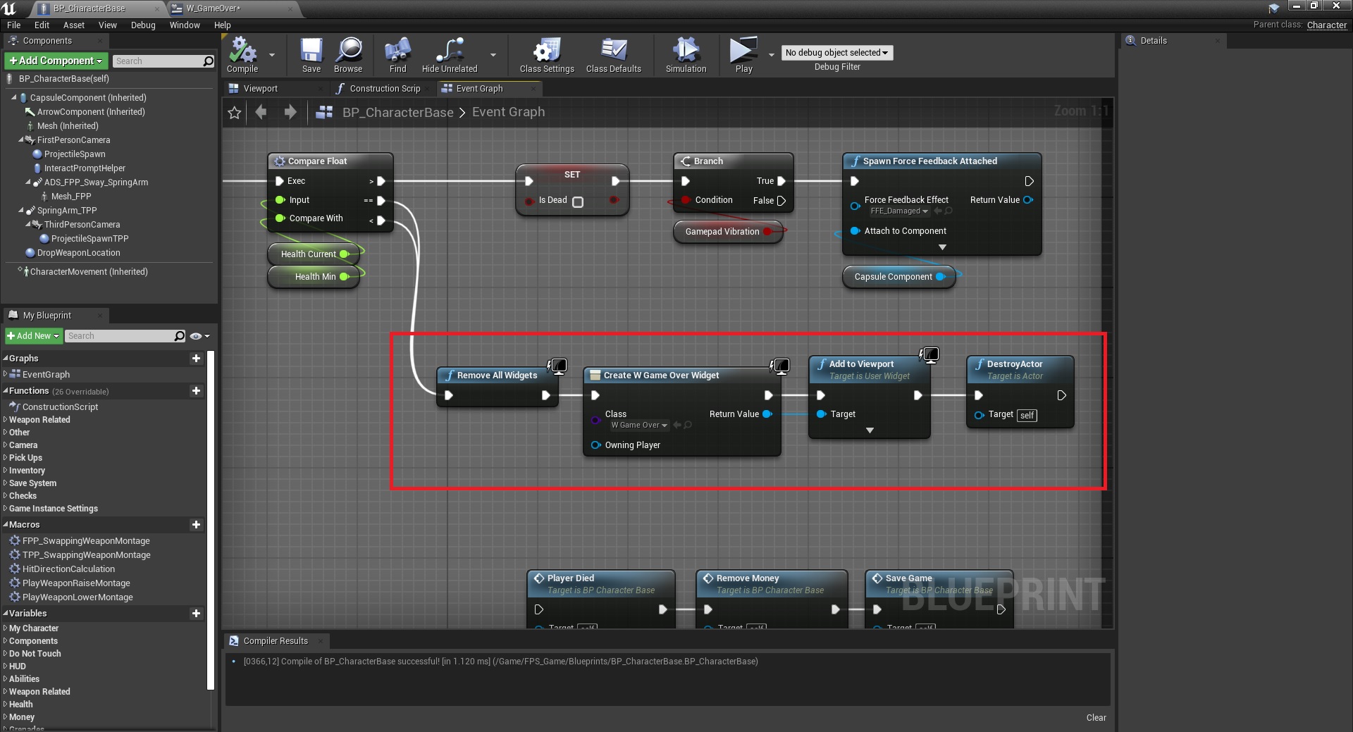 3. Open BP_CharacterBase and disconnect the player died logic and tell it to show the widget instead