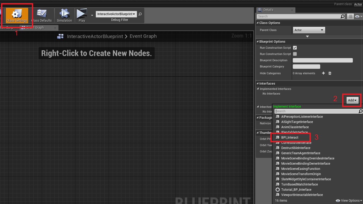 After that, go to Class Settings and add the BPI_Interact interface and Compile.