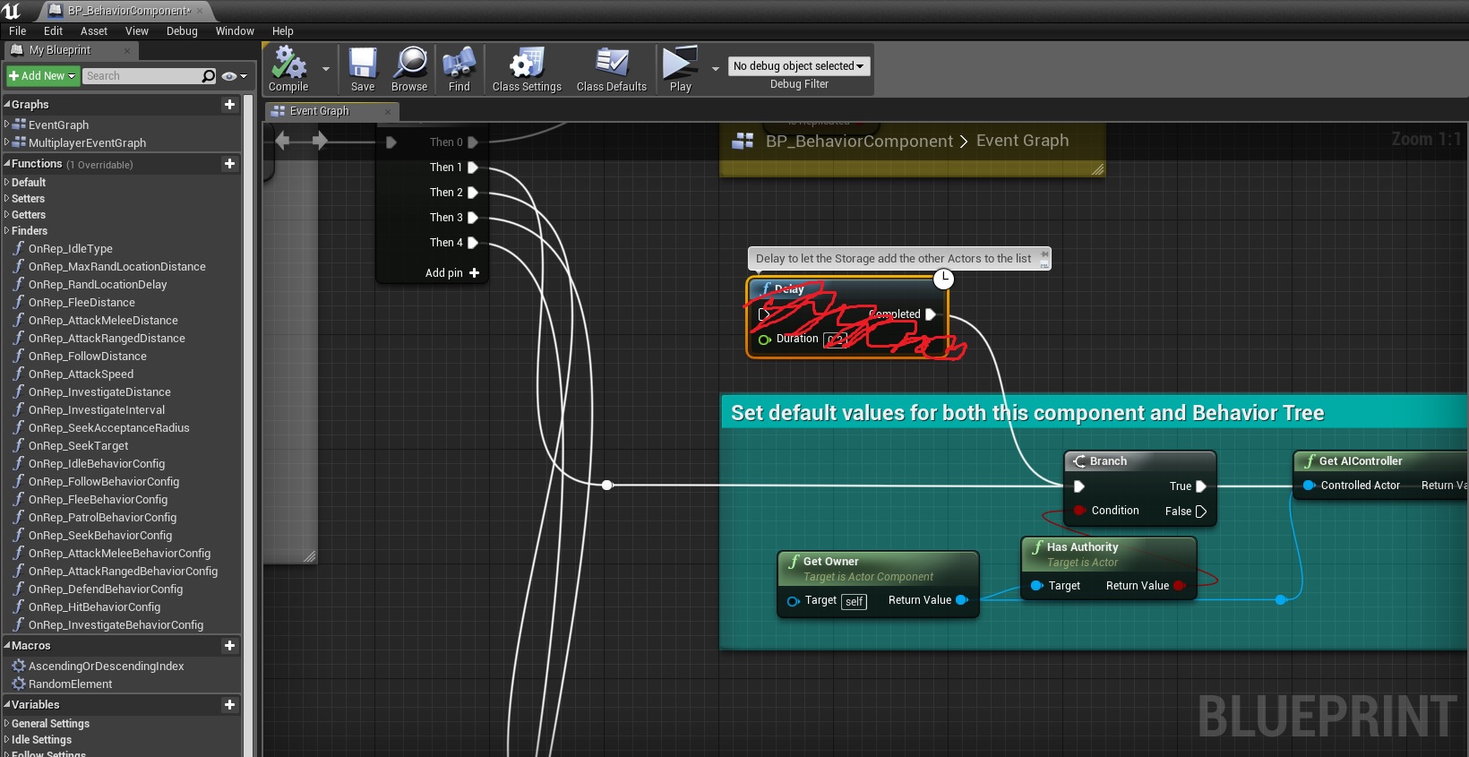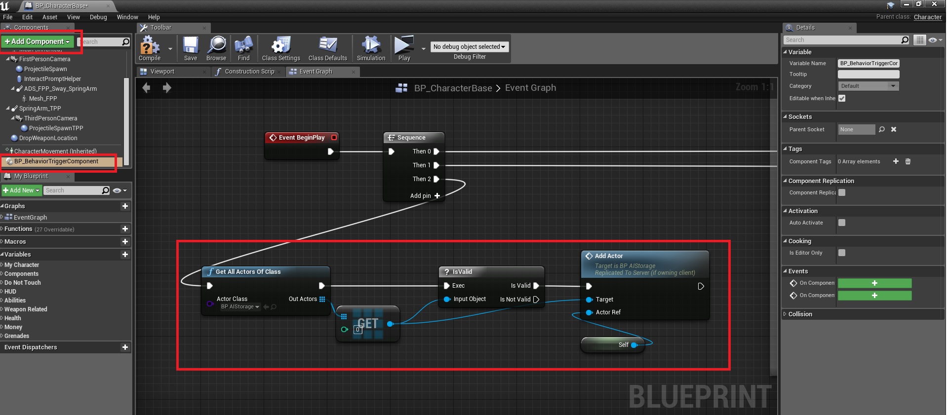 7. still on BP_CharacterBase, add a component called “BP_BehaviorTriggerComponent” and add the following anywhere on Begin Play