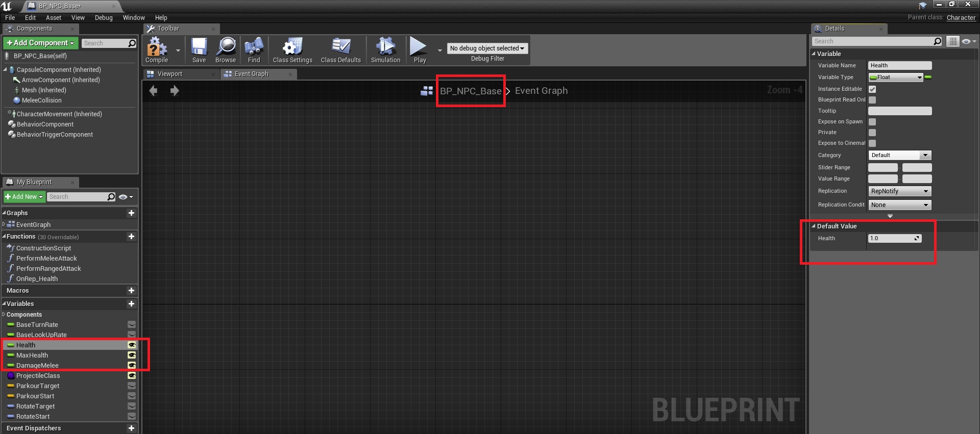10. now open BP_NPC_Base (AIBehaviorToolkit/Blueprints/) and change its health and damage values, this is a required step because of the different health logic used.
