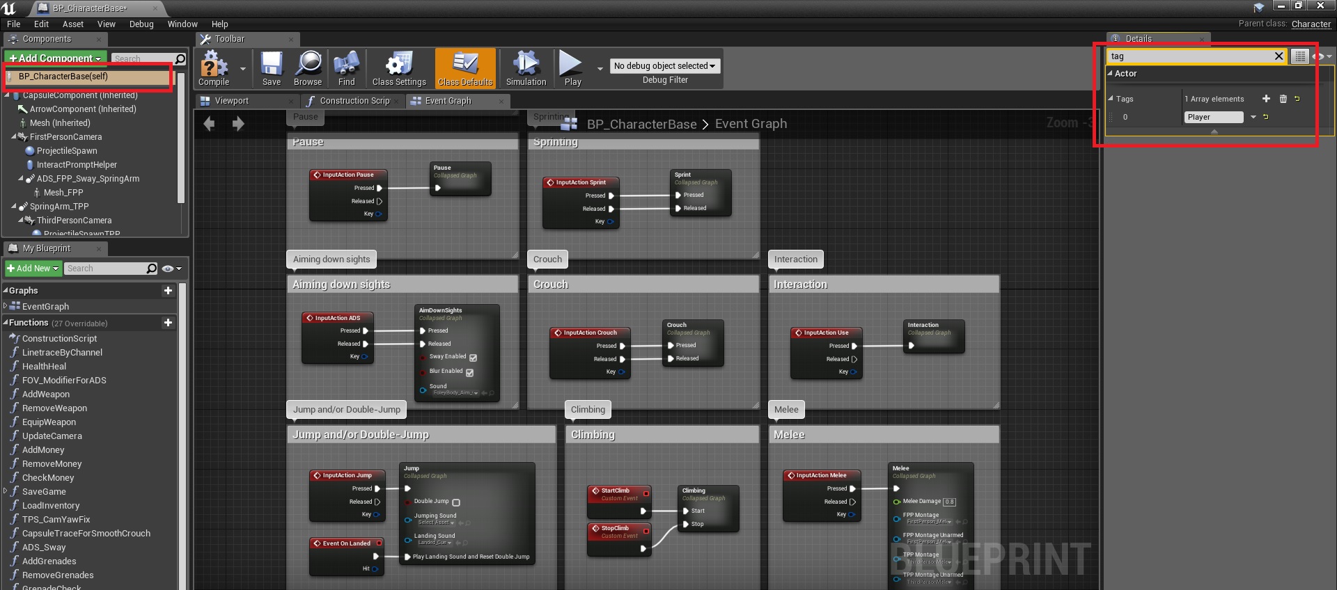 6. open BP_CharacterBase (FPS_Game/Blueprints/) and add the tag “Player”
