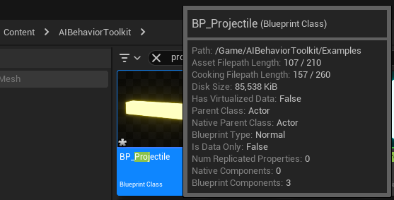 9. now open the BP_Projectile from the AI toolkit (AIBehaviorToolkit/Examples/) and reduce the damage it does from 5.0 to 0.1