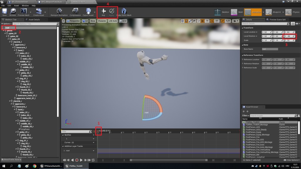 5. (NOT REQUIRED FOR VERSION 2.7 AND ABOVE) Once that is done, open the animation and pause it, put it on the beginning, click on the root bone, rotate it to face the same axis as the default UE4 arms, click on add key, then apply and save (in that order)