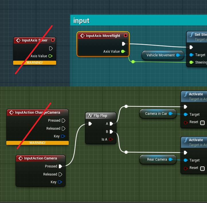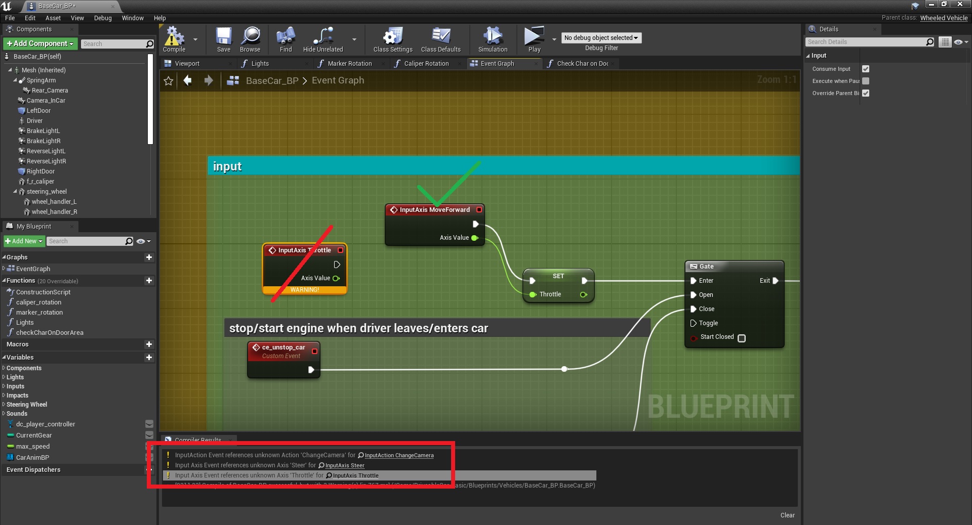 5. Now to the Drivable Cars Basic Pack, this will be somewhat involving, but it’s not that hard, start with BaseCar_BP and press Compile, it will give a LOT of warnings, this is because in Project Settings different input keys were used, so these need to be manually changed, basically replace old ones with new ones that are already in FPS Game Starter Kit
