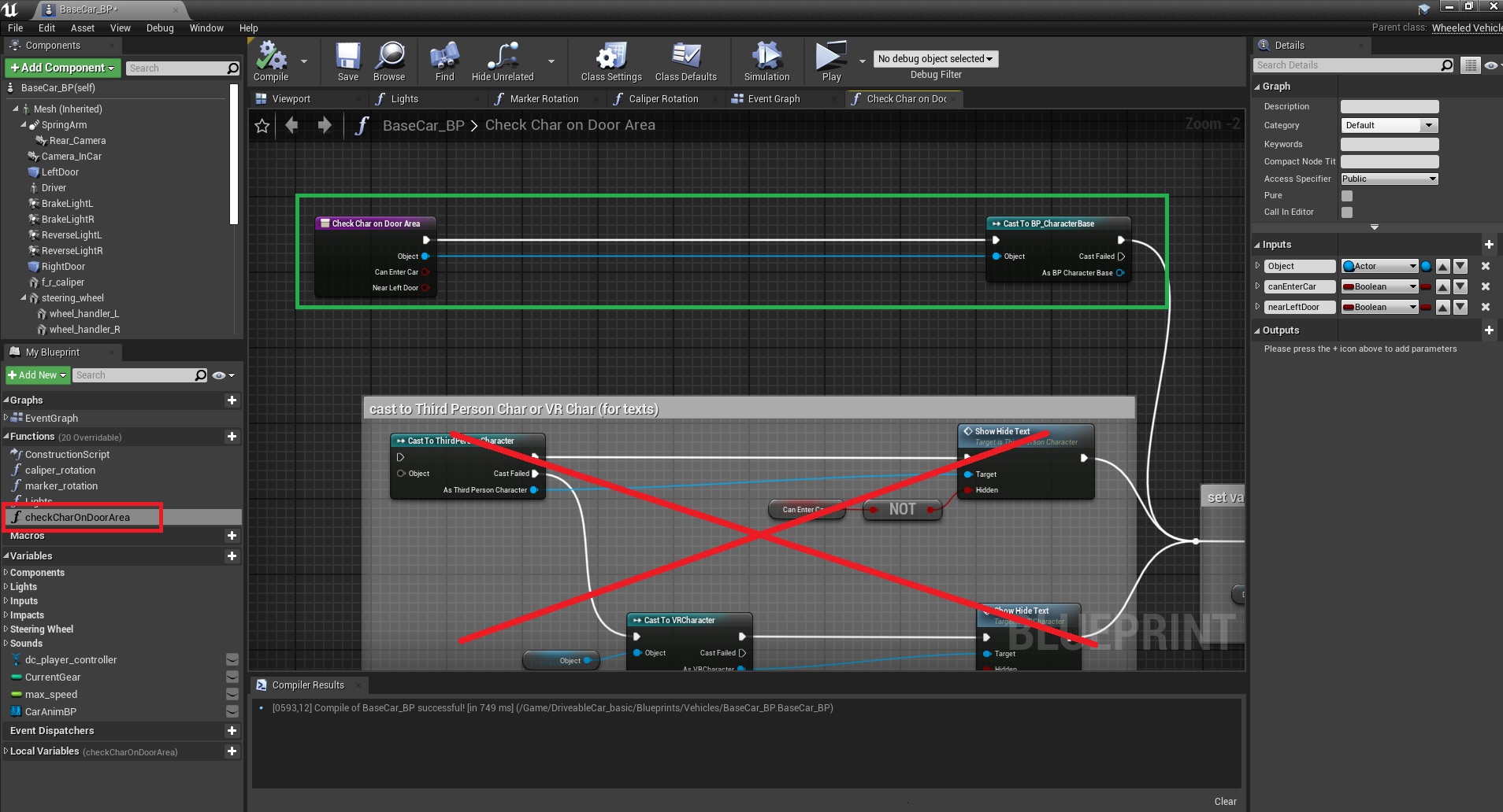 6. Once that is done, still on the same blueprint, open the checkCharOnDoorArea function and replace the old characters with BP_CharacterBase