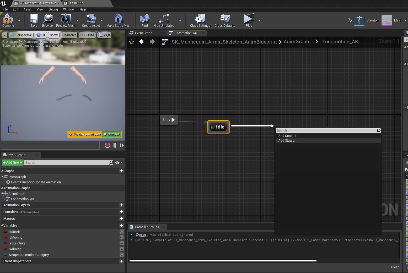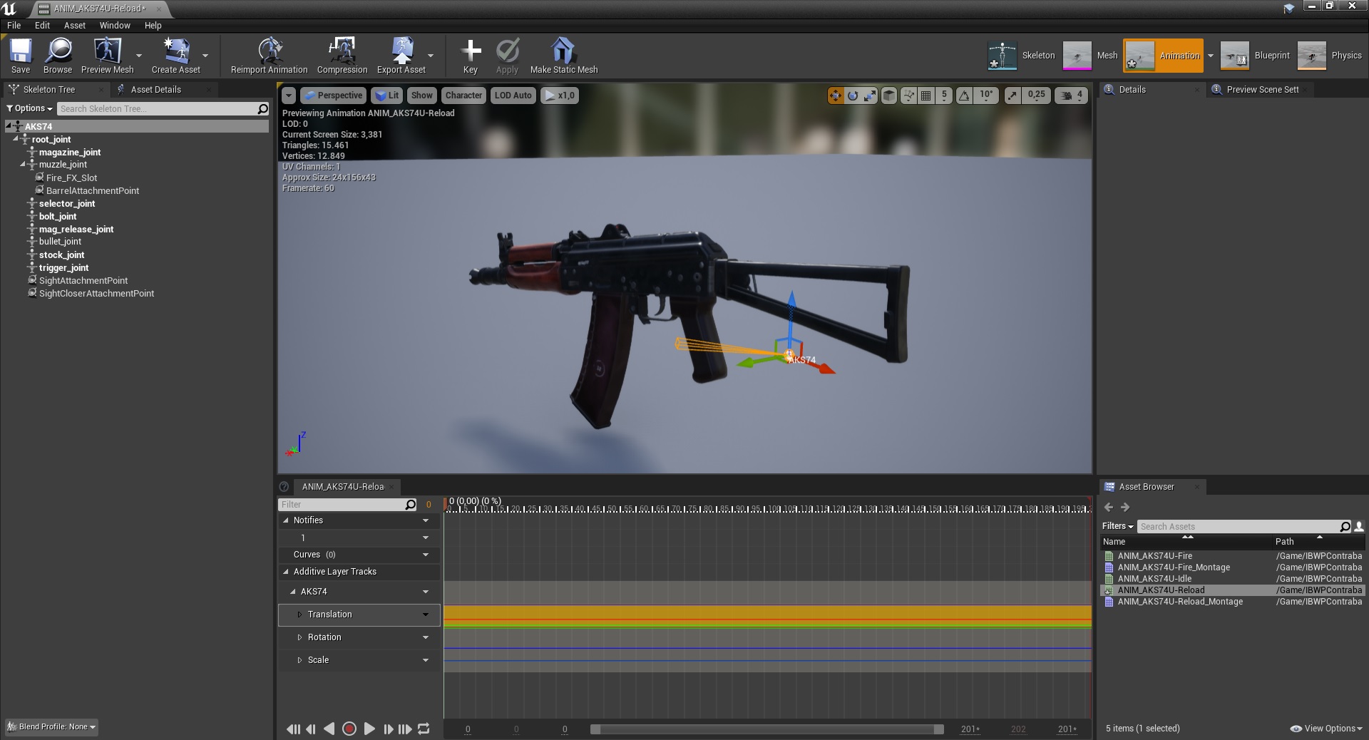 16. Weapon mesh animations are tricky because they’re rotated (should stay still and look the same direction as the default UE4 weapon, but they don’t), you can use persona to rotate them by -90 Z and move them slightly back, add key, apply, save.