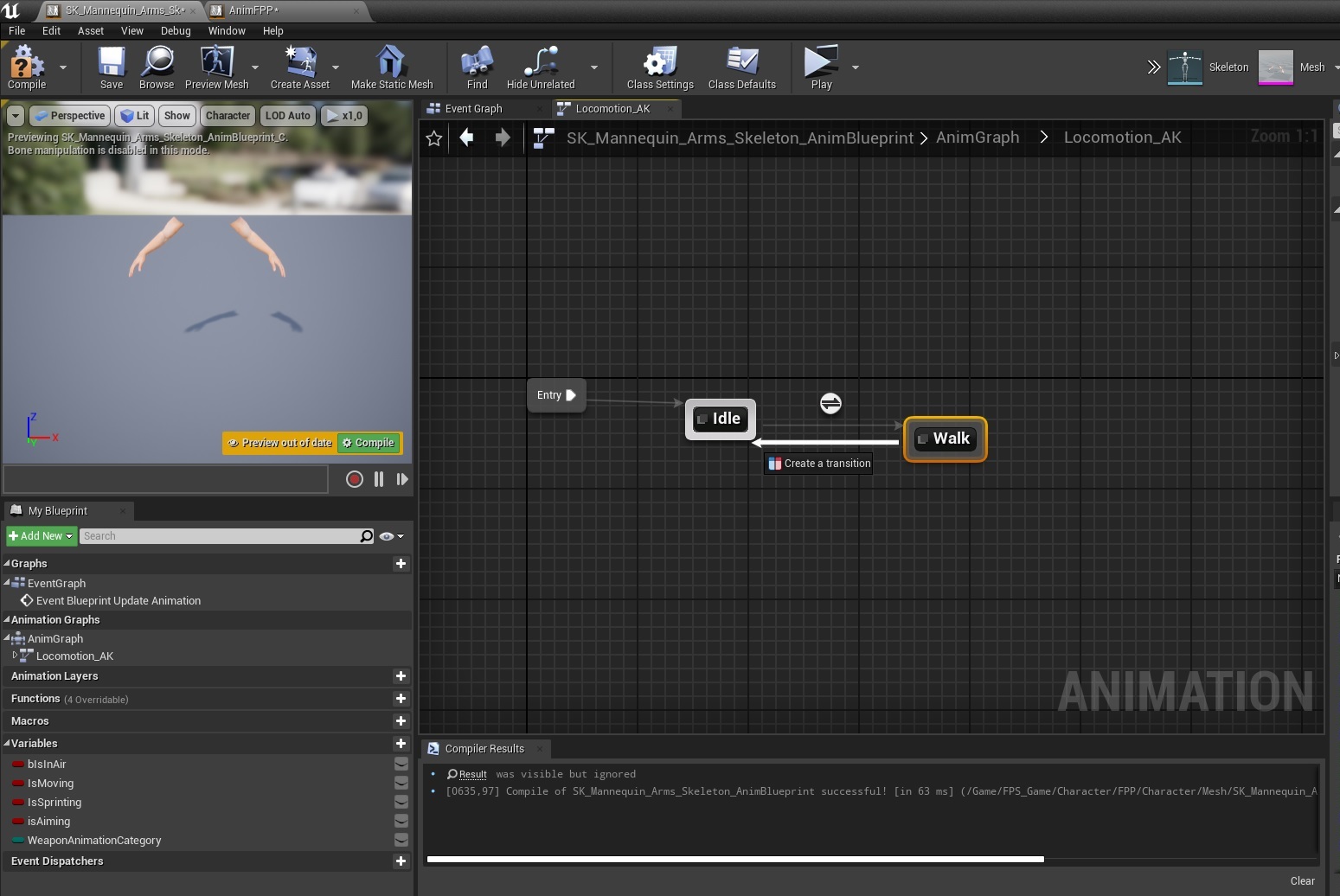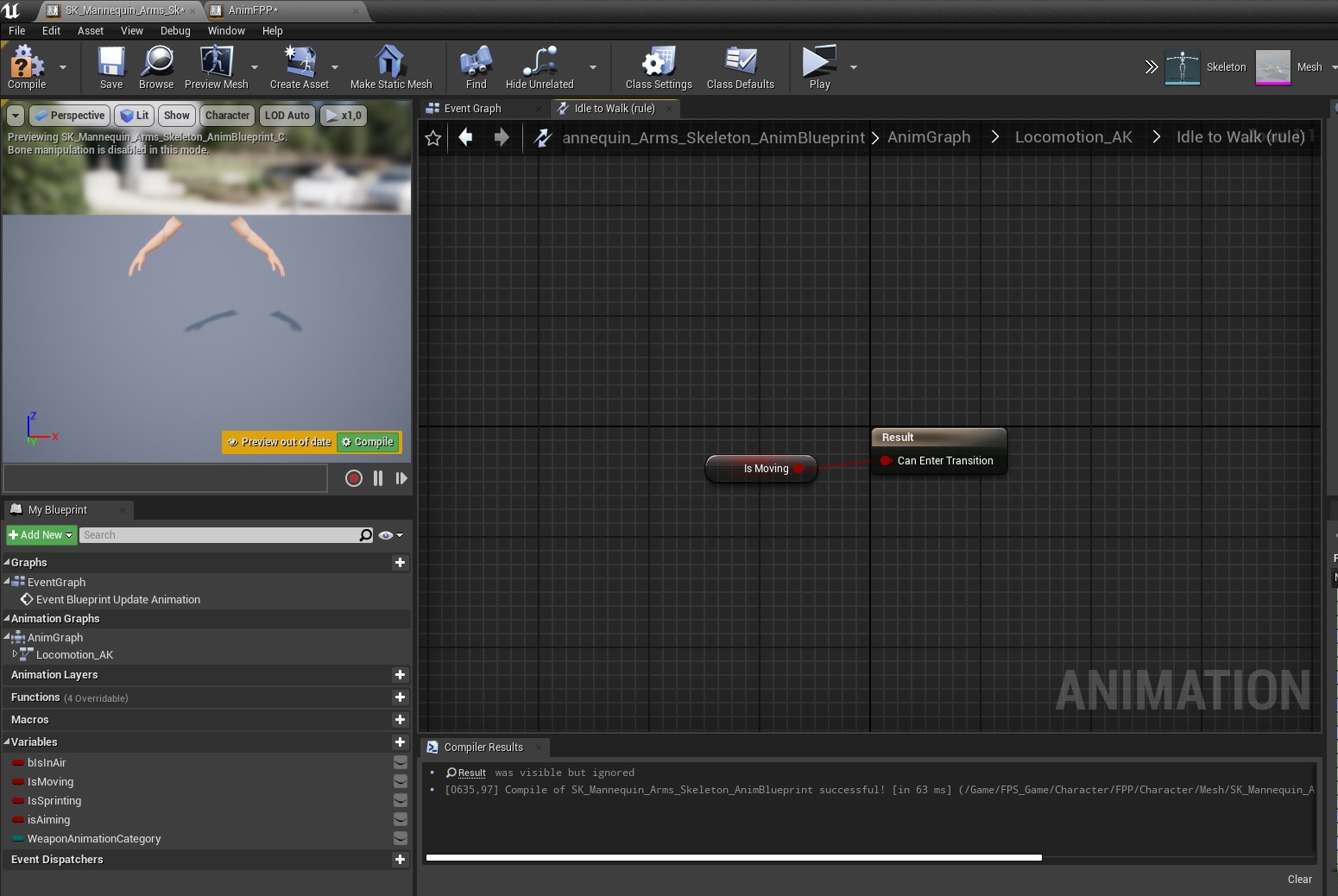 9. Inside the transition nodes use IsMoving (Idle to Walk) and IsMoving=NOT (Walk to Idle)