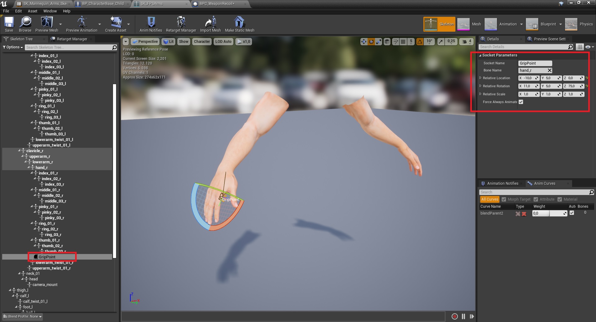 13. Open the ironbelly arms skeleton and add a new GripPoint socket, this is where the weapon will be attached. NOTE: if you plan to mix the ironbelly animations with the default ones, I recommend that you name the socket differently, leave GripPoint as it is, but add GripPoint_Ironbelly or something along those lines, then in the weapon child class you can just tell which socket it should use.