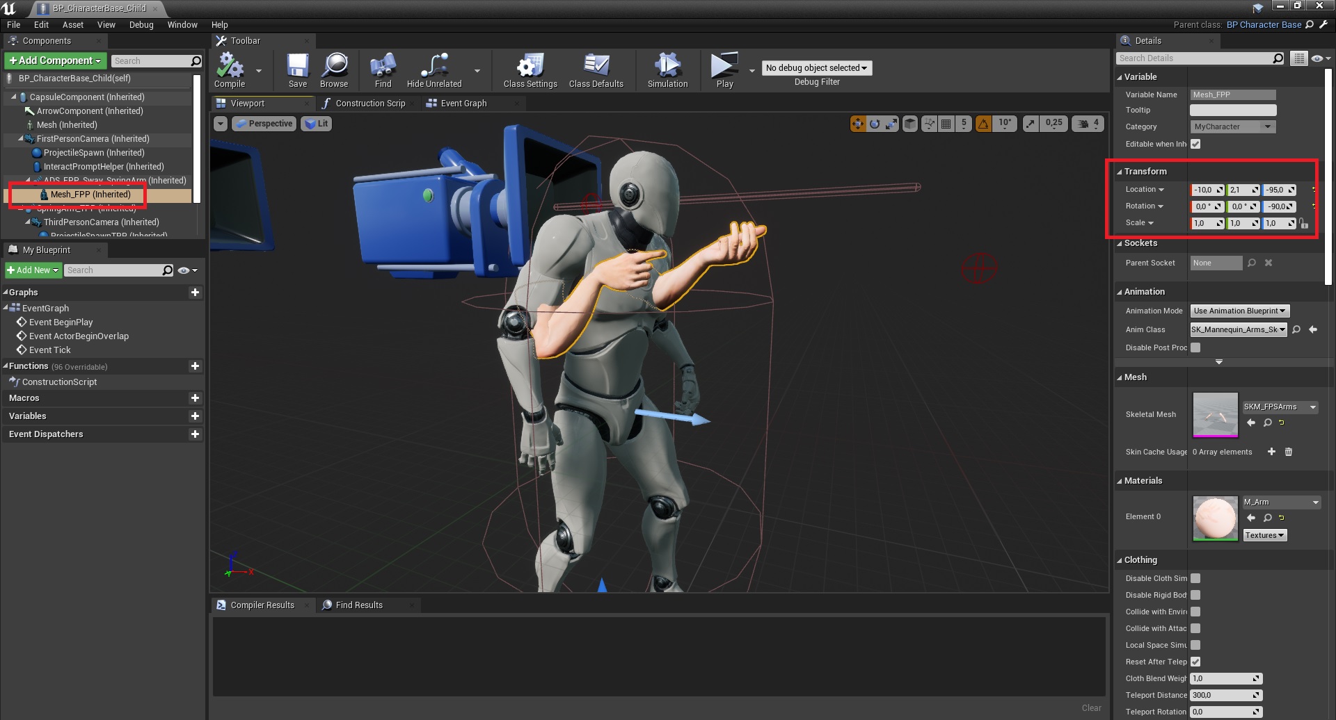14. Inside the character move the arms into this position to account for the different axis rotation and location. NOTE: if you plan to mix the ironbelly ones with the default ones, keep an eye on the Y axis here, for the default ones I use 0.0 value, so if you change it here to be like in the picture, you can still align aiming properly via weapon child class and in its Other Tweaks section (X and Y translation, and of course ADS Correction)