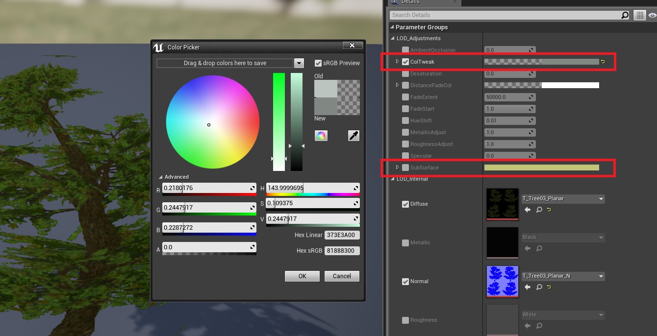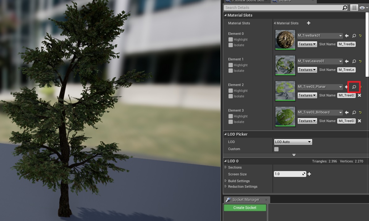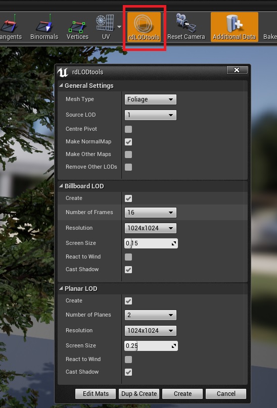 4. Now when you open a mesh asset, a new button will be visible, when you click on it, it will give you a list of settings. You can leave these settings on default, but feel free to play around with them, it kinda depends on the asset you’re using. In this case I’m using a not very optimized tree (as in, no LODs or anything of the sort).