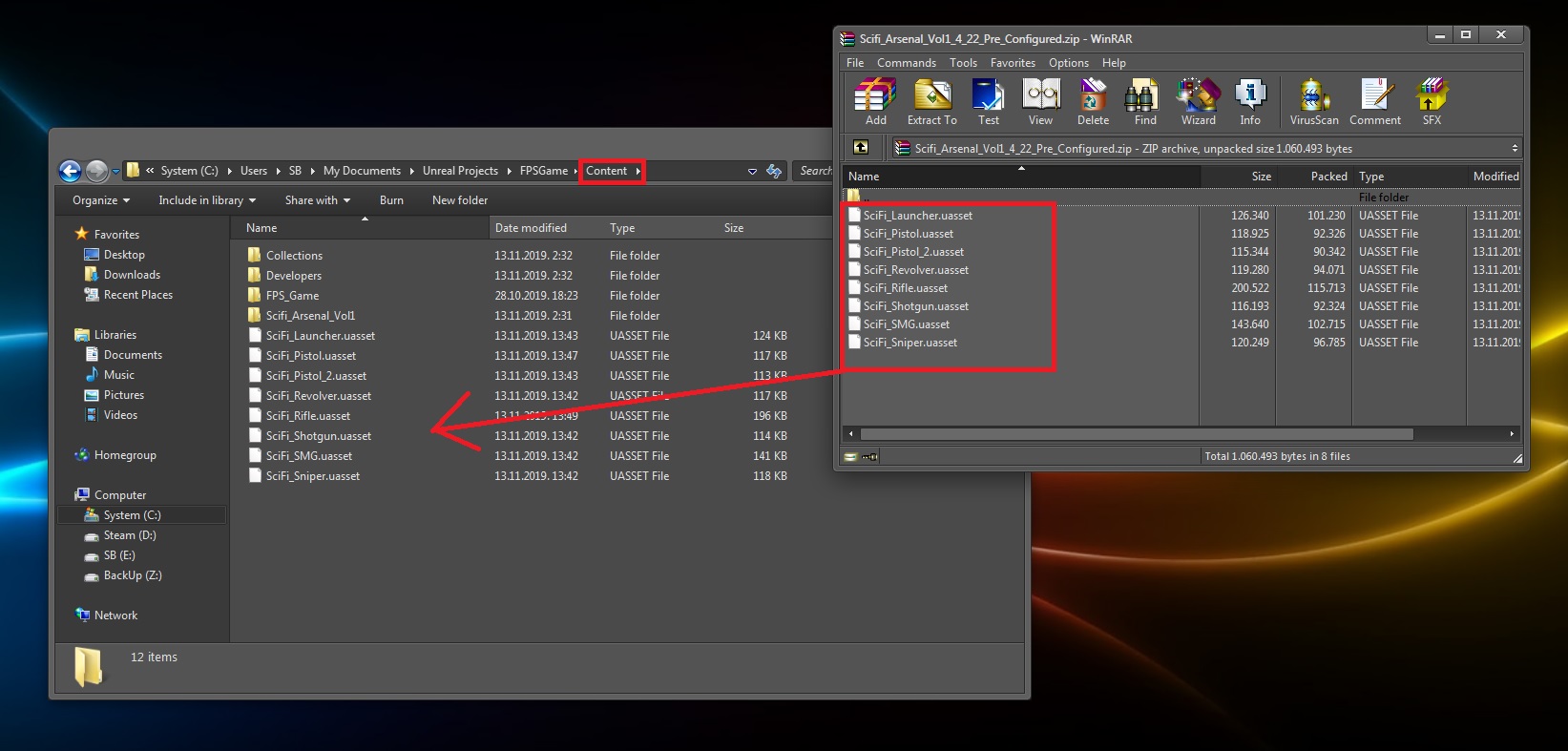 2. Download end extract the pre-configured weapon child classes that I made, you can put them anywhere inside the Content folder. Use Windows Explorer (or whatever your default file browser is)