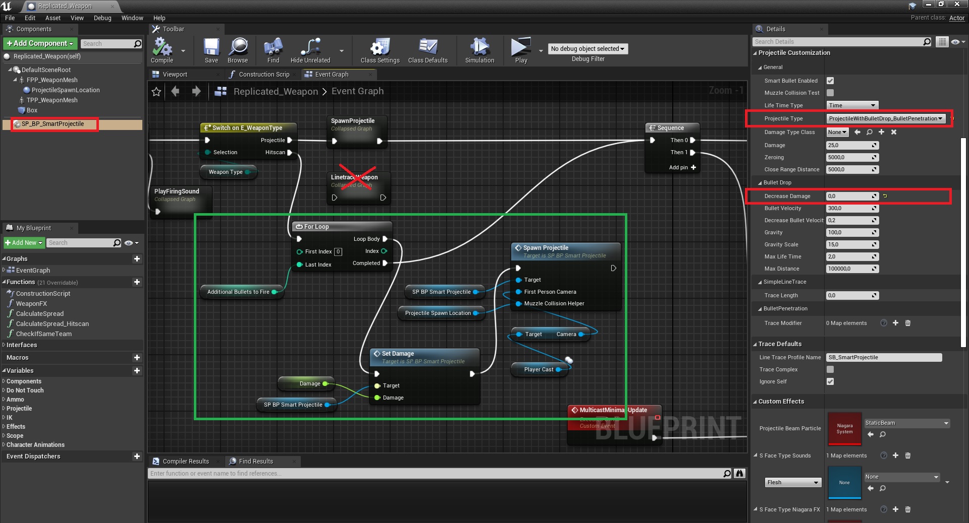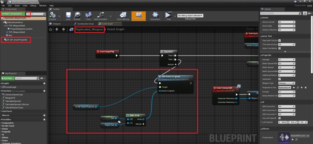 4. Open Replicated_Weapon, add a new component (smart projectile) and on the weapons begin play, simply add a sequence and this to it