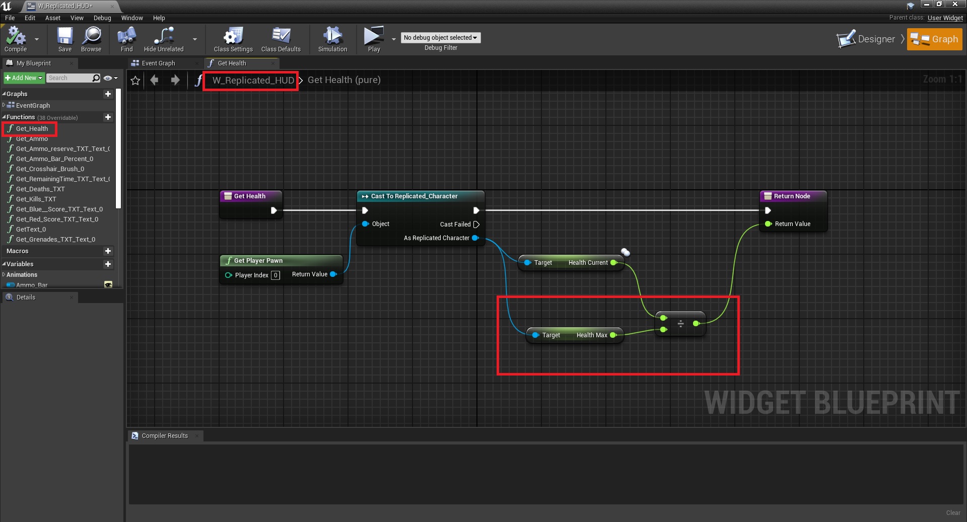 5. Optional, but if you want to increase health so that the damage falloff works trough walls, you can change that inside Replicated_CharacterBase and in the W_ReplicatedHUD widget add this: