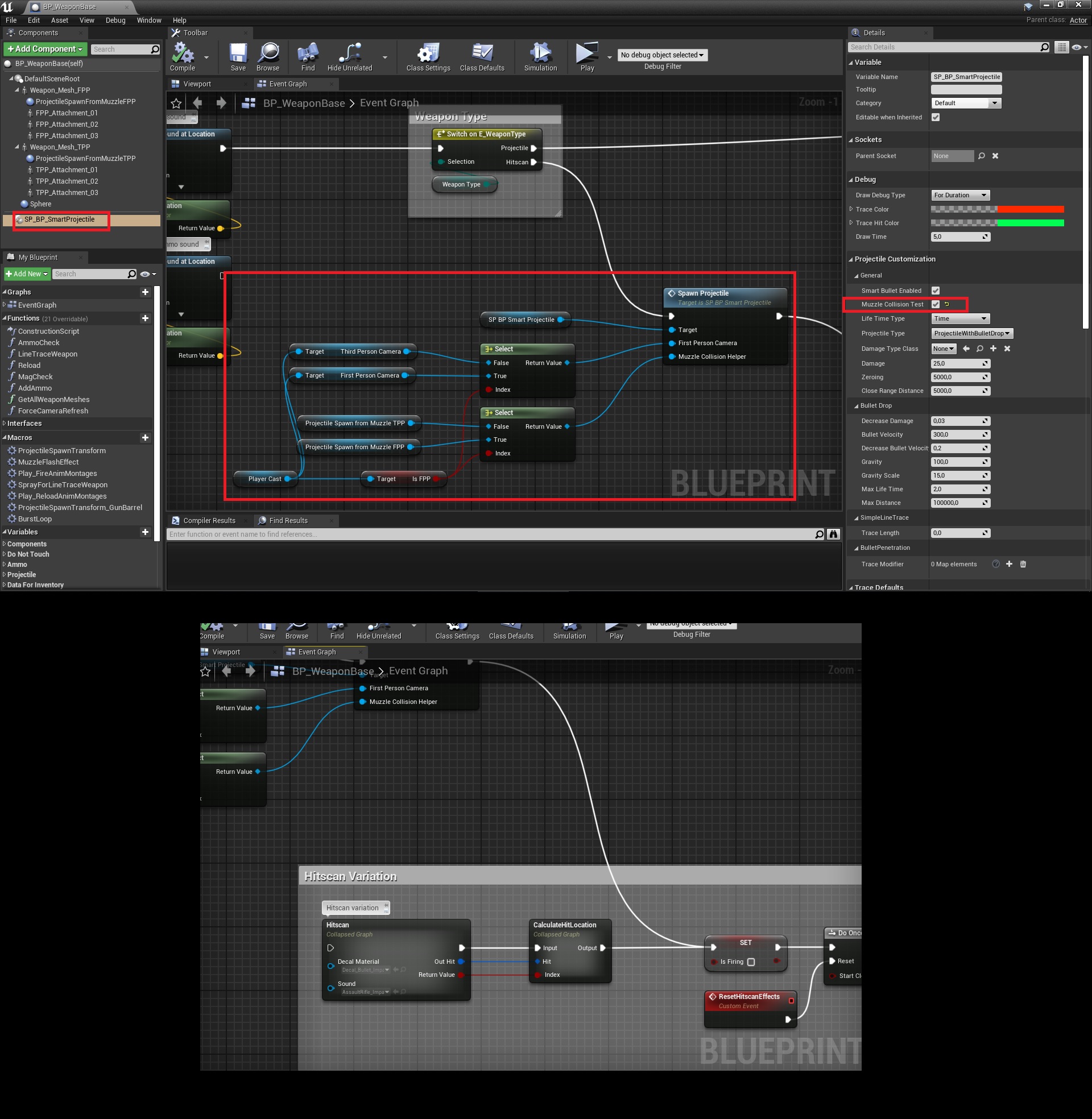 Just open BP_WeaponBase, add the component and replace old hitscan logic, and make sure to enable the “Muzzle Collision Test” checkbox, this will make it work in third person mode too.