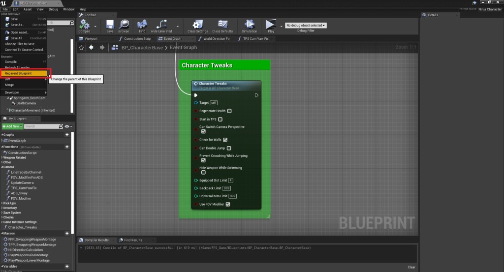 4. Open BP_CharacterBase, click on File, Reparent Blueprint
