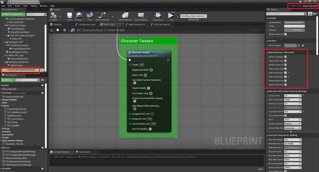 6. Compile and Save, it should have the Ninja section in the movement component now, you can tell if it’s good to go if in the upper right corner it says Parent Class: NinjaCharacter