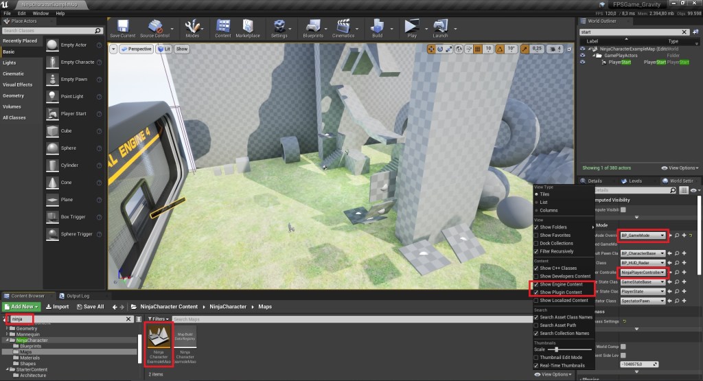 8. Make the Engine Content folder visible and search for the Ninja example map, while there, in its world settings set the game mode to be BP_GameMode and switch the player controller class to use the ninja one instead of the default one. The reason for the controller change is because it uses its own camera manager inside that controller.