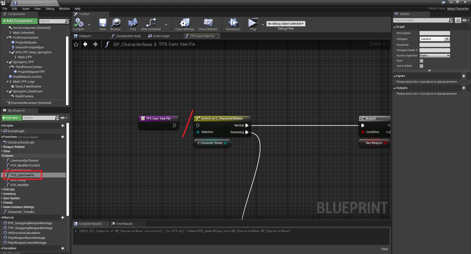 7. Still on the character, open the TPS_CamYawFix function and disconnect it so that it doesn’t do anything, this is the easiest way to turn it off, it’s there to make the camera movement free or locked based on if you have a weapon or not, but it interferes with the plugin if you’re in third person and don’t have a weapon, so disable it.