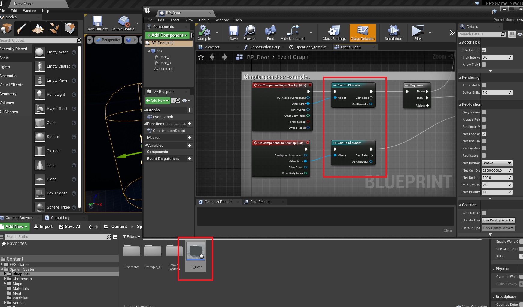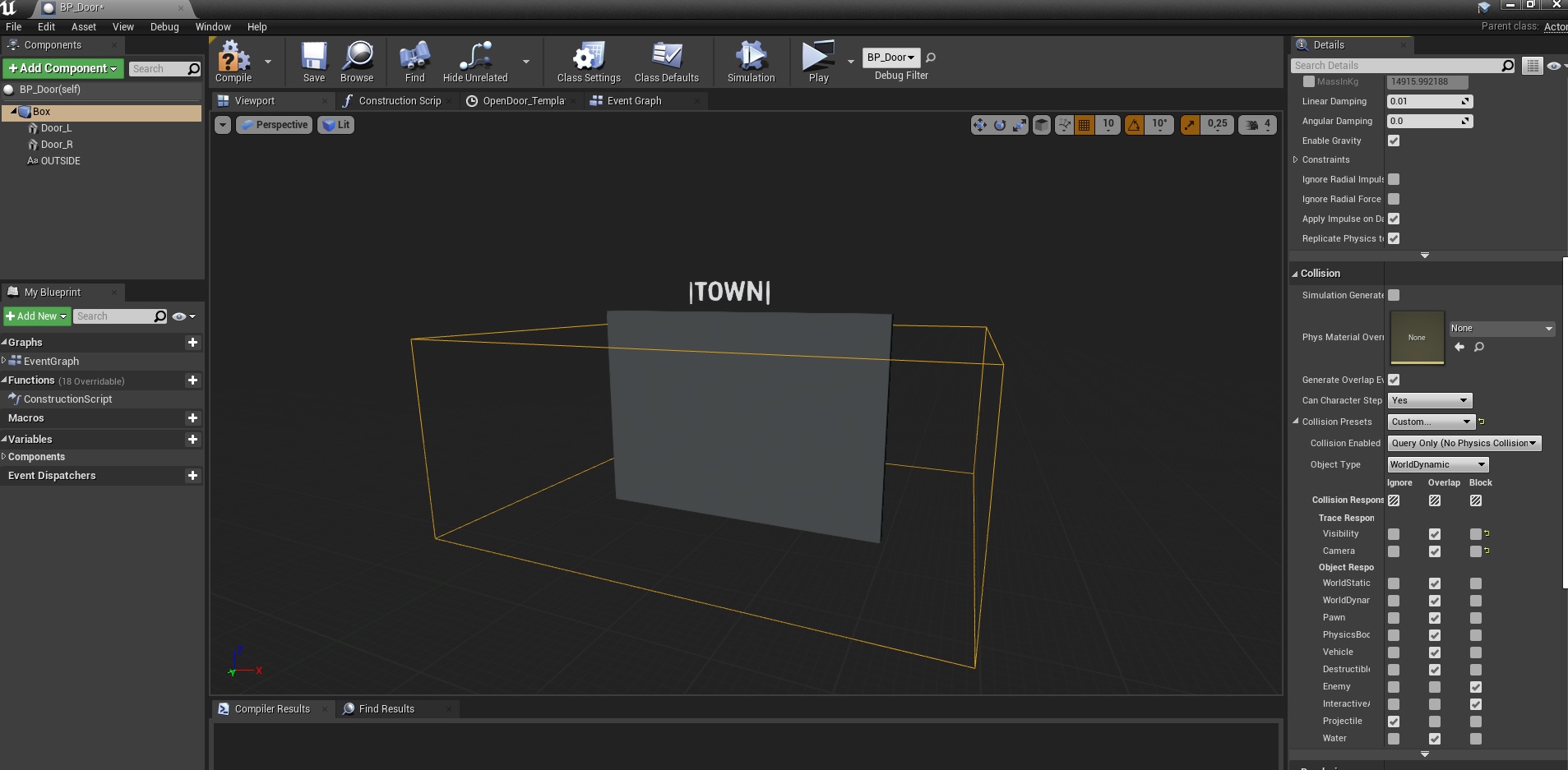 2. While there, open the door blueprint and set the overlap character like in the image bellow, so that it registers the FPS Game Starter Kit character and the doors box collision to ignore projectiles.
