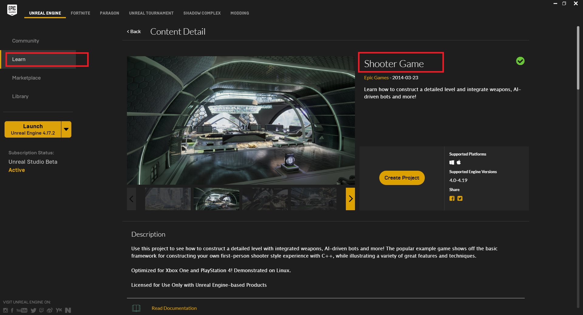 1. Open the Launchers Learn Tab, find and create a ShooterGame project