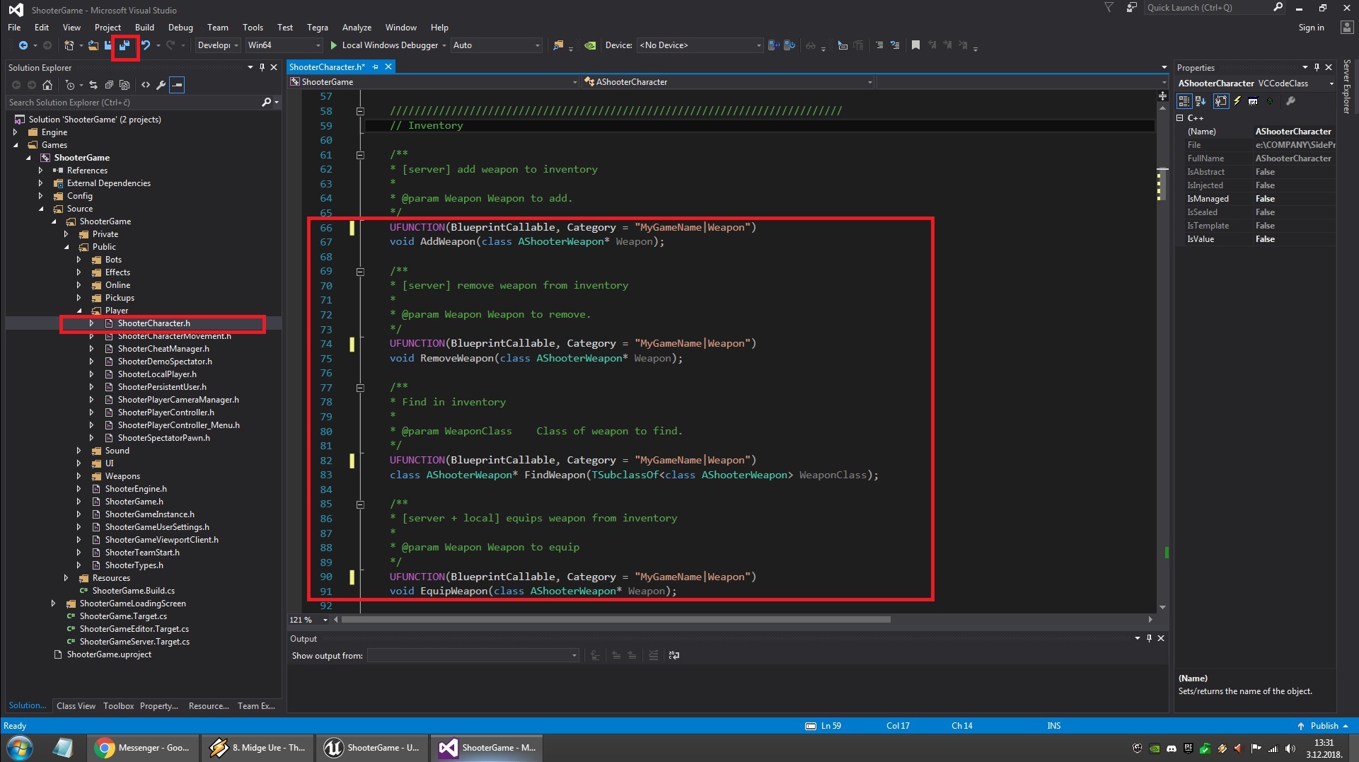4. Once that is done, open the project and find ShooterCharacter.h and make the following modifications to it, then press the Save All button