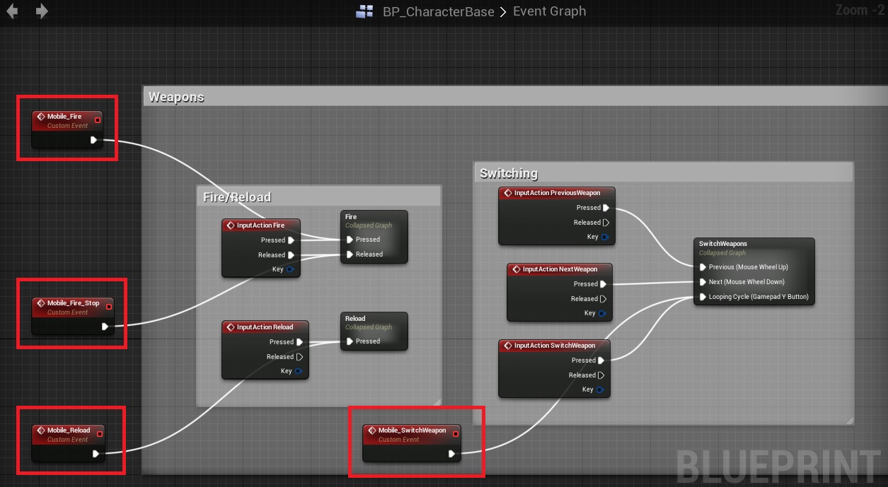 3. Open BP_CharacterBase and add Custom Events to whatever action you want the character to do on a mobile device. This is important because it’s the only way to call those events from a touch screen (without the use of external plugins or gestures).