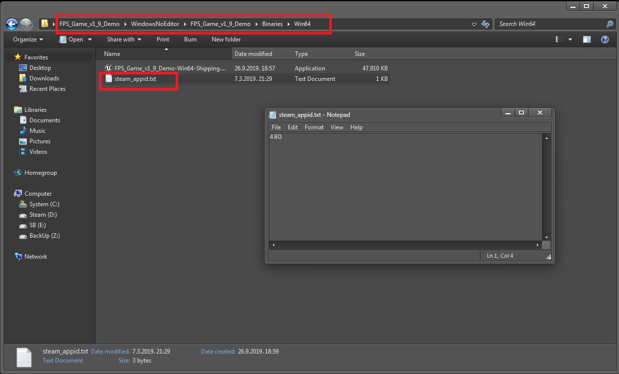 4. Place this text file where the .exe of the compiled game is, that file is not required when putting the game on Steam as it will generate it on its own. Also note the path leads to the Binaries/Win64 folder, as there are 2 exe files and this one is the correct one.