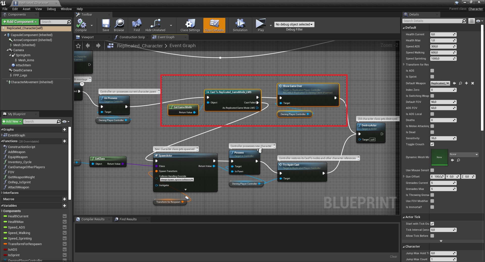 4. Open Replicated_Character and add this to its death logic, the idea here is not to respawn while in Last Man Standing / Battle Royale mode