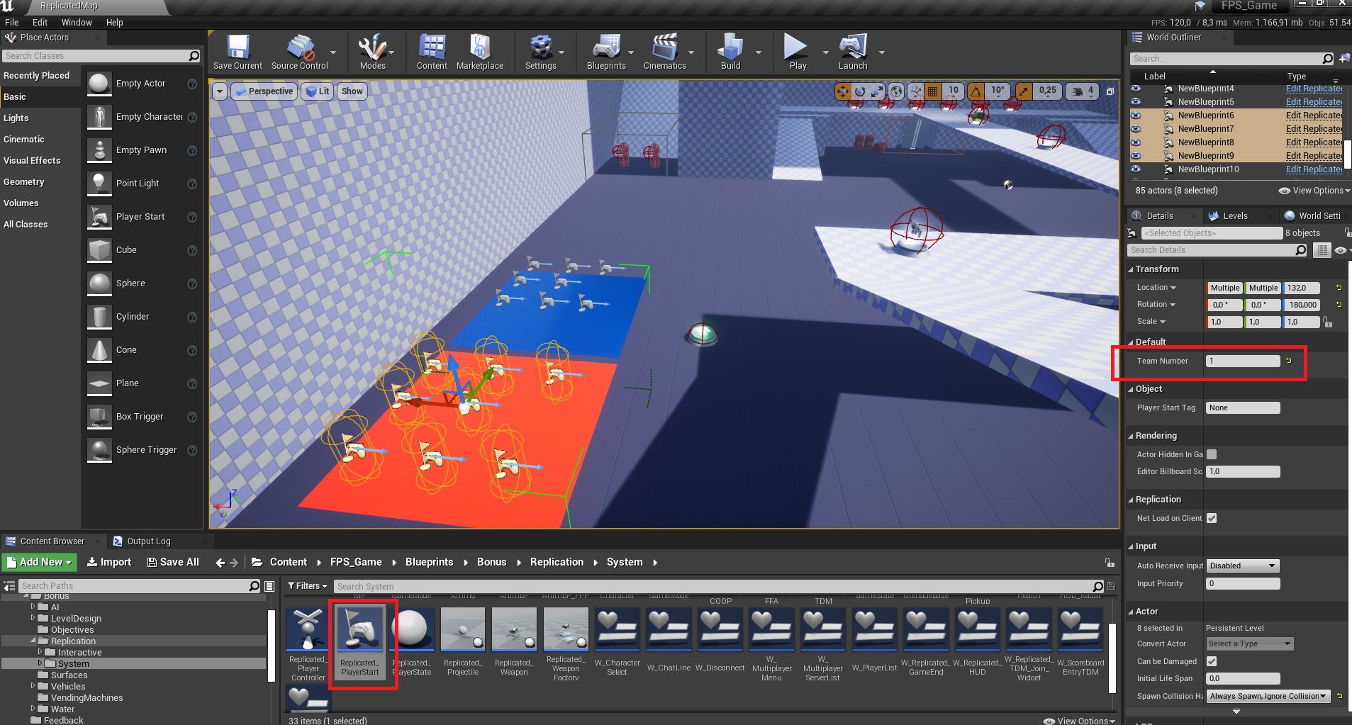 Make sure to add 16 of the replicated player starts, 8 of which should have the team set to 0 and the other 8 set it to 1 (blue team is 0, red team is 1)