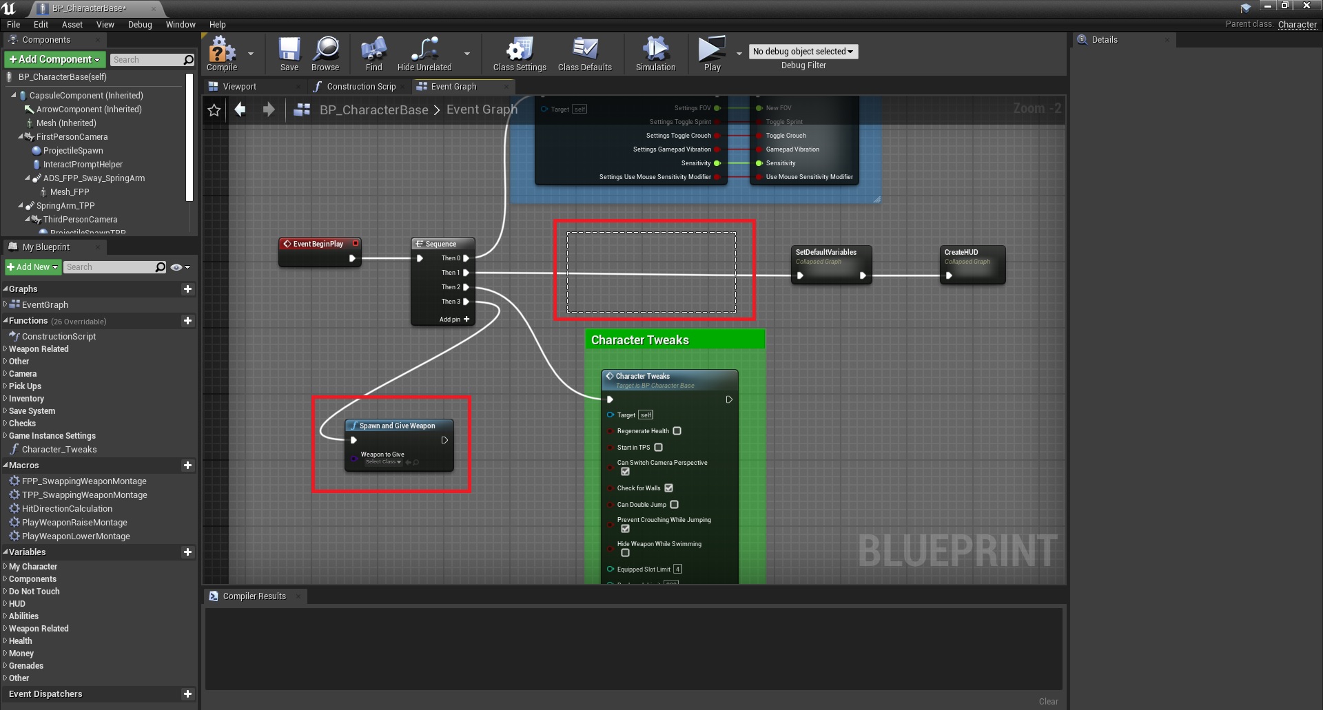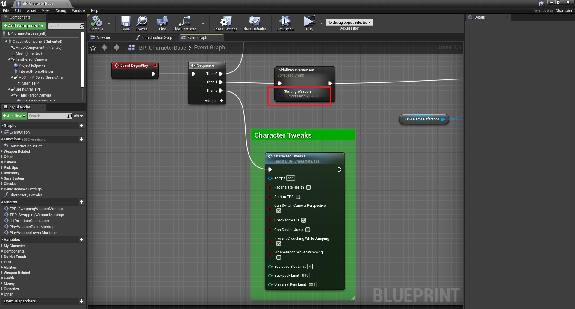 1. Open BP_CharacterBase and add any weapon child class that you want the starting weapon to be