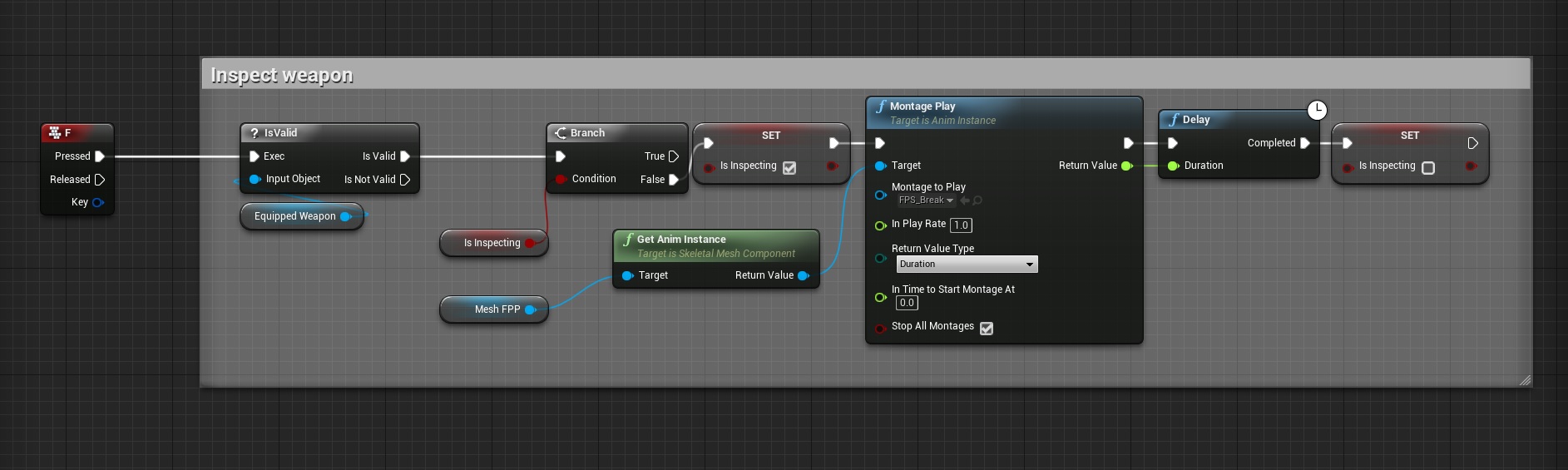 This tutorial is actually more about animations than it is for the feature in the title, to add a weapon inspect ability, just add this blueprint to the character and set your montage to play.