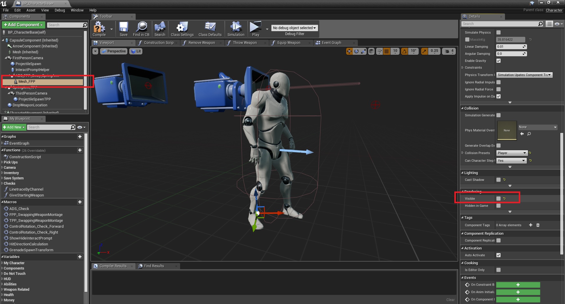 3. Open BP_CharacterBase (FPS_Game/Blueprints/) and on Begin Play set these checkboxes to look like this, basically make it TPS only.