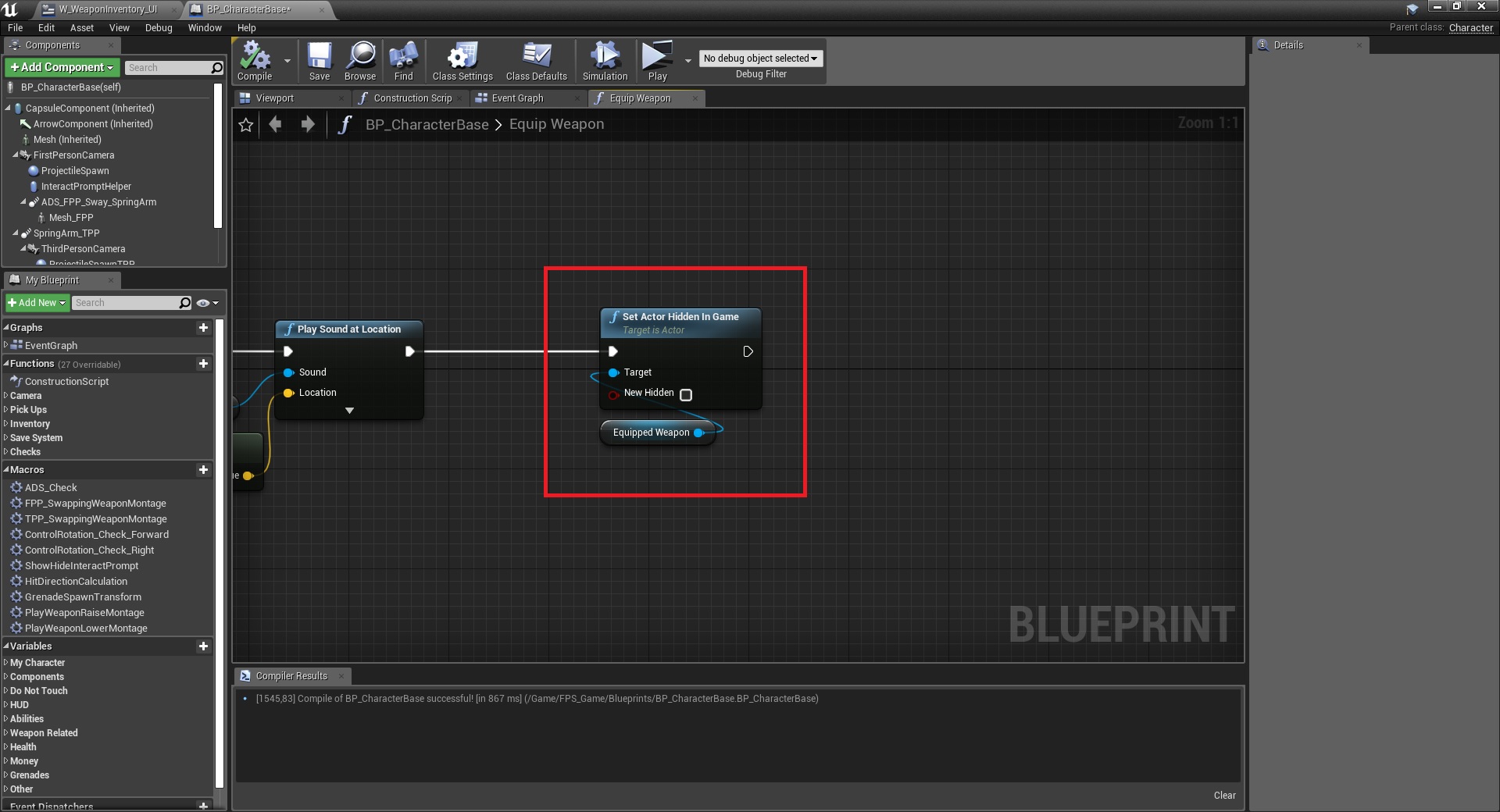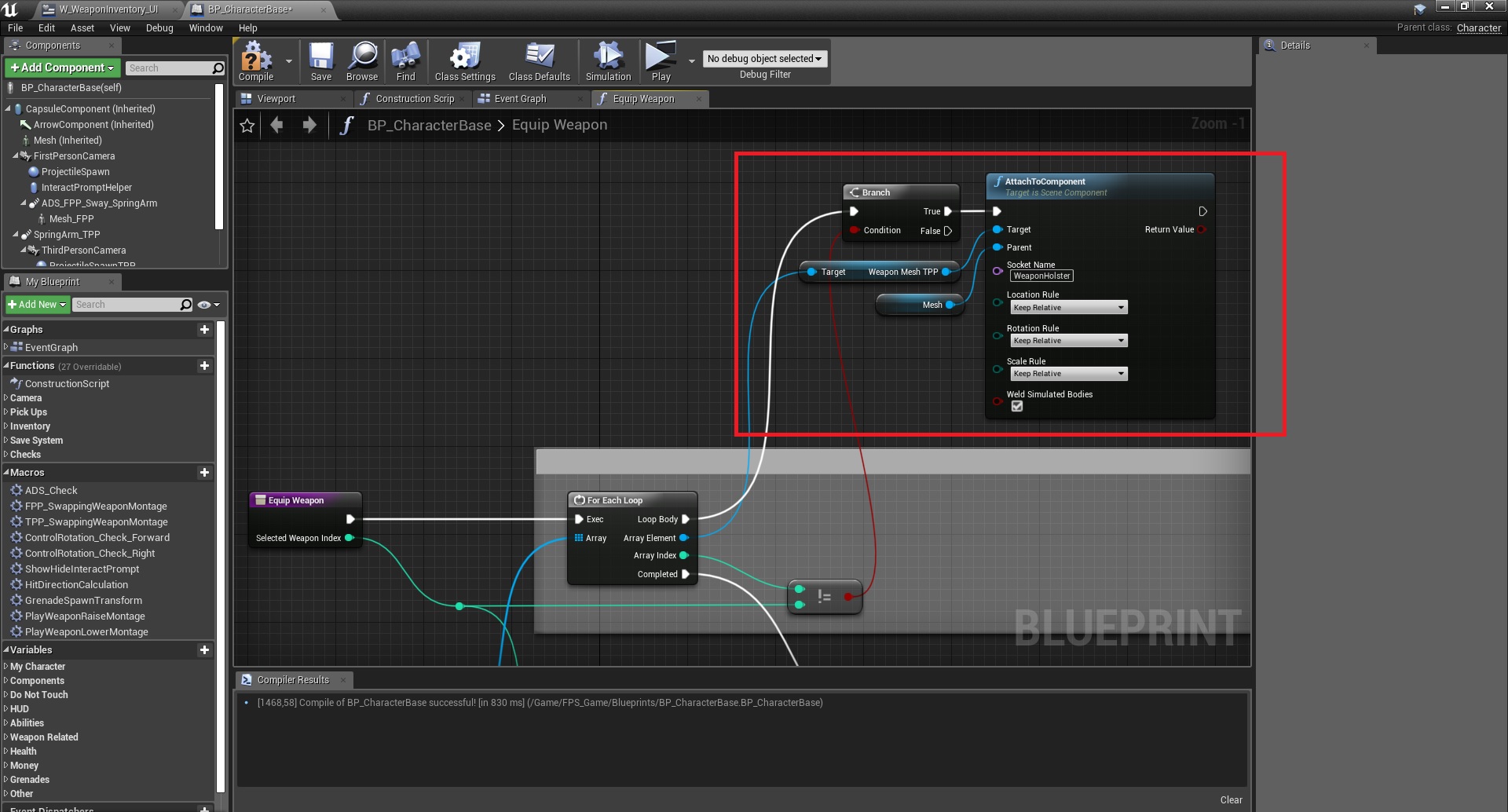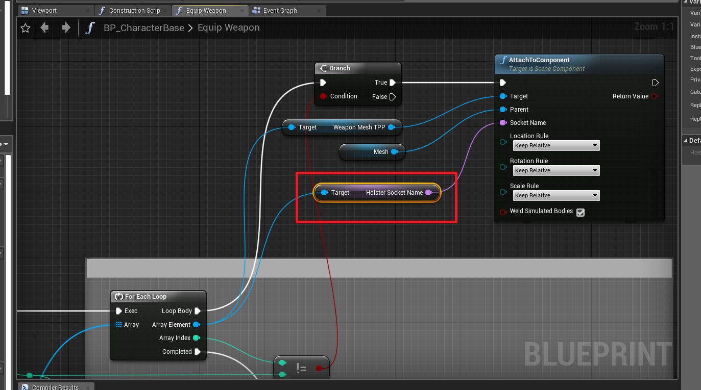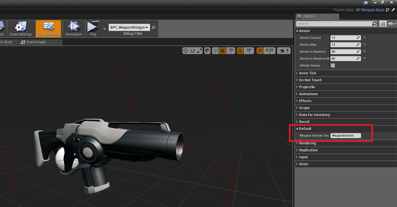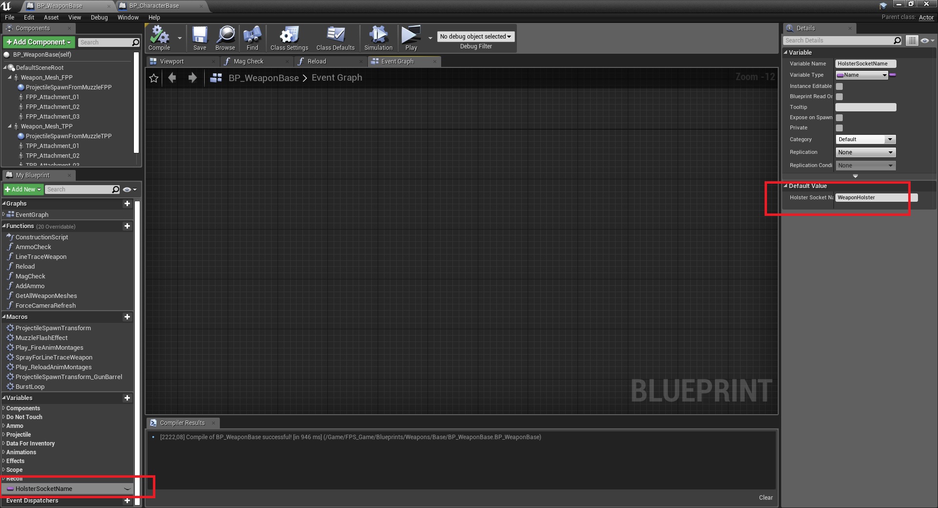 6. Open BP_WeaponBase (FPS_Game/Blueprints/Weapons/Base/) and create a new Name variable, this can be used as the holster socket name in the EquipWeapon function on the character, so each weapon will be able to have its own attach holster socket. Default value for the Name is irrelevant, but put WeaponHolster in there, for the sake of having a default name in all weapon child classes already set.