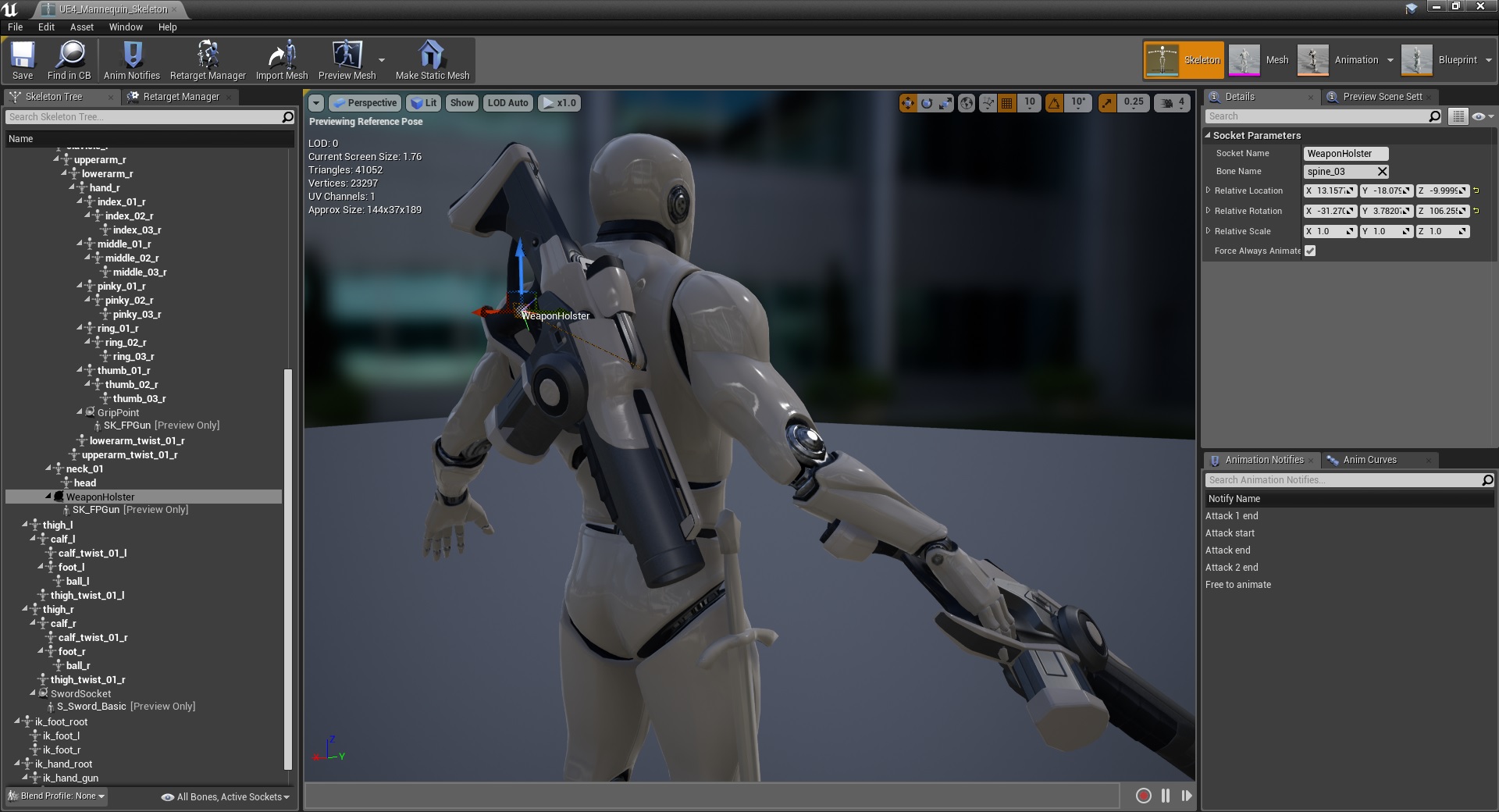 I noticed that there are many people who use my FPS template to make a TPS game, so I decided to write this page in order to fill in the gaps regarding some stuff that exist in TPS games but not in FPS games, such as a weapon holster socket on the back of the character.. In the past this was a somewhat messy process, but I streamlined it quite a lot and these things are easier to do now.