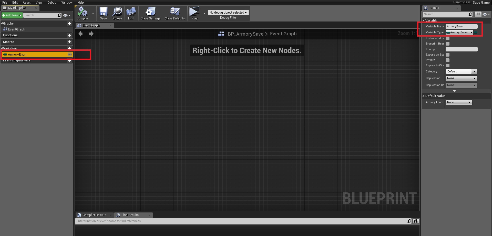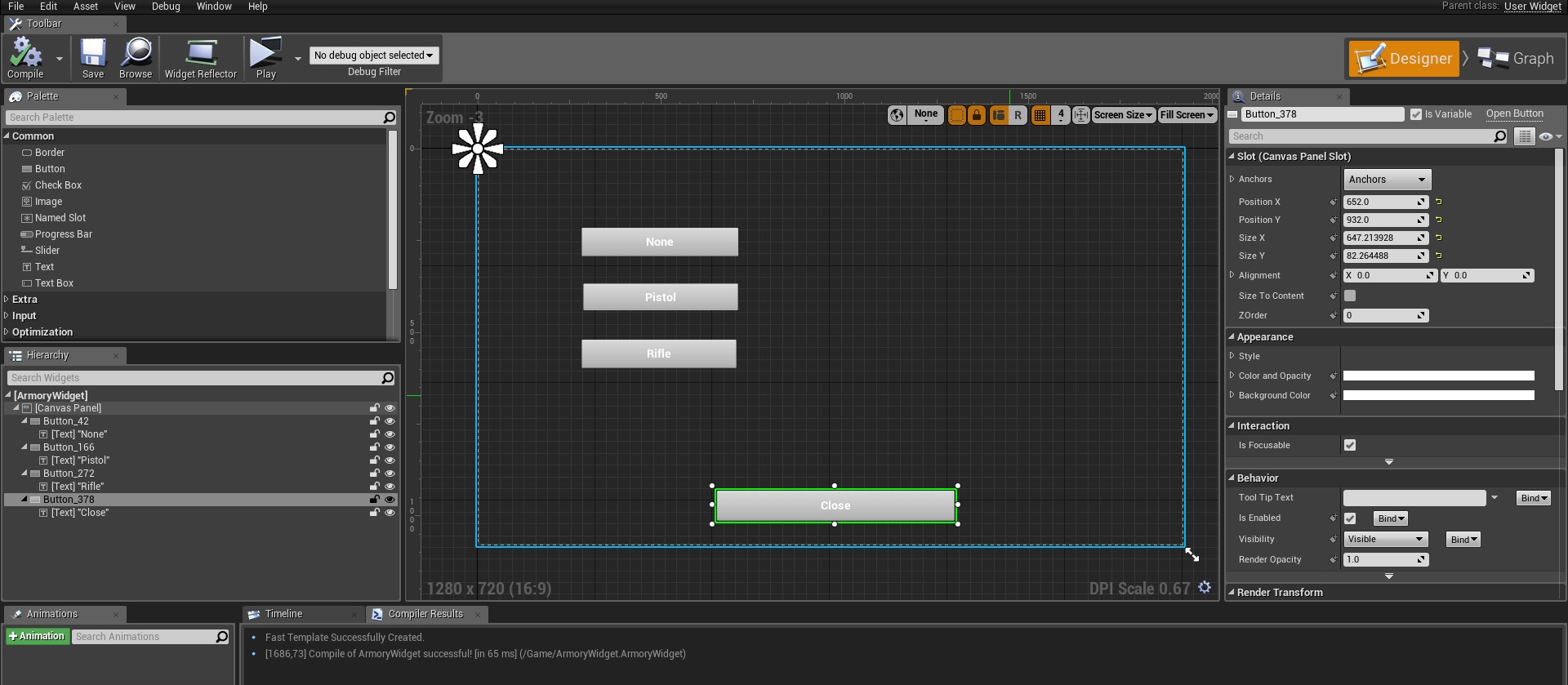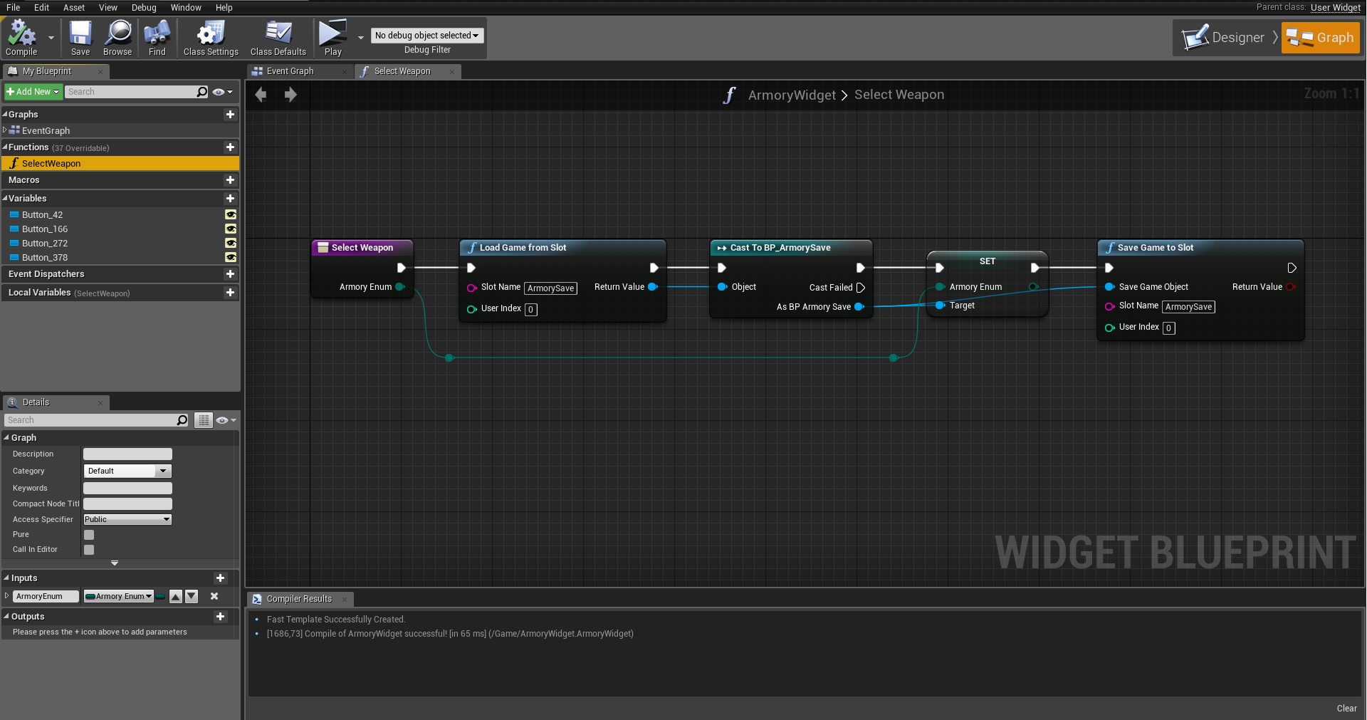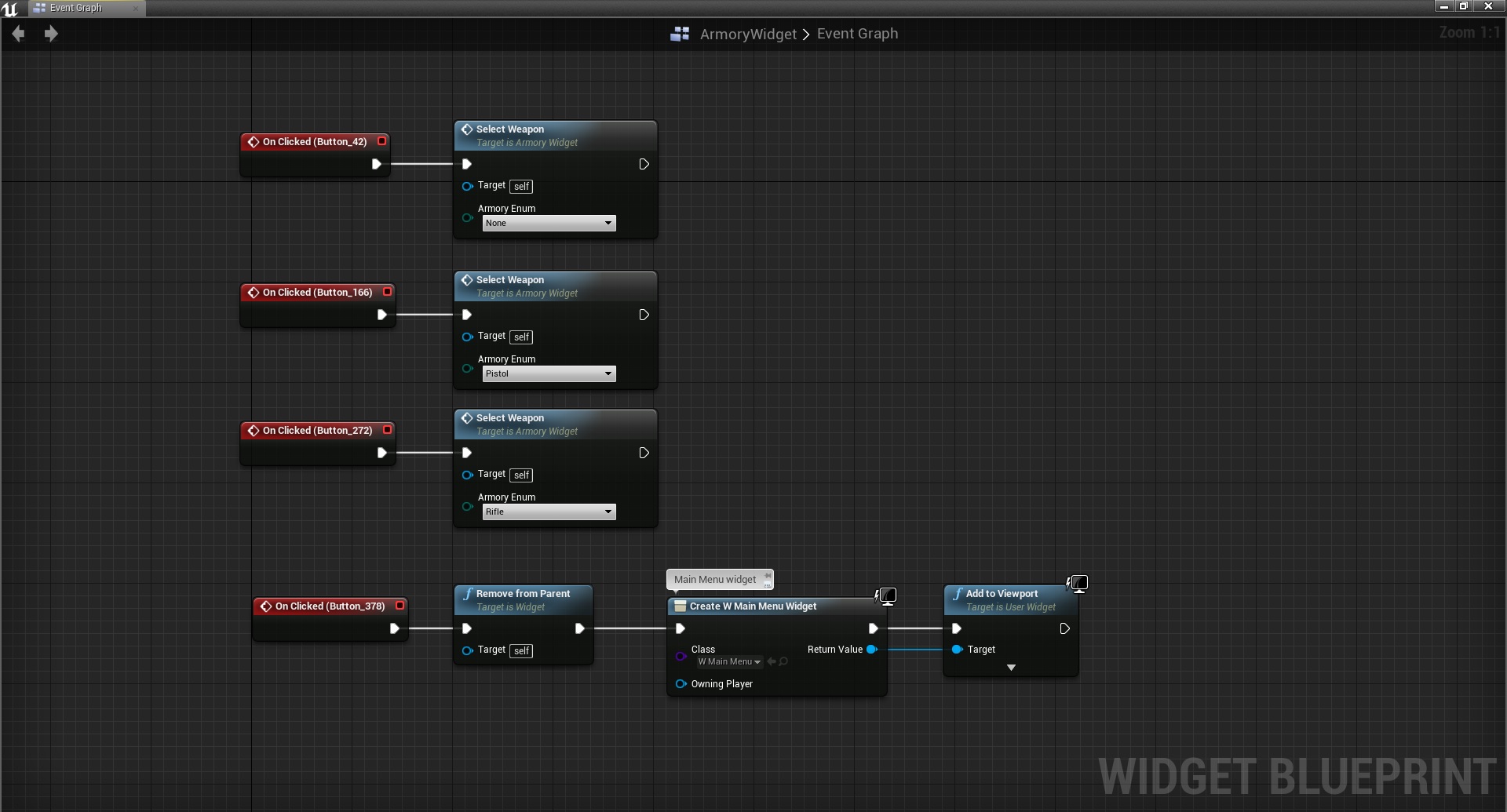 4. In the Armory widget that you created, add a few buttons for each of the weapons that are in the ENUM and a close button