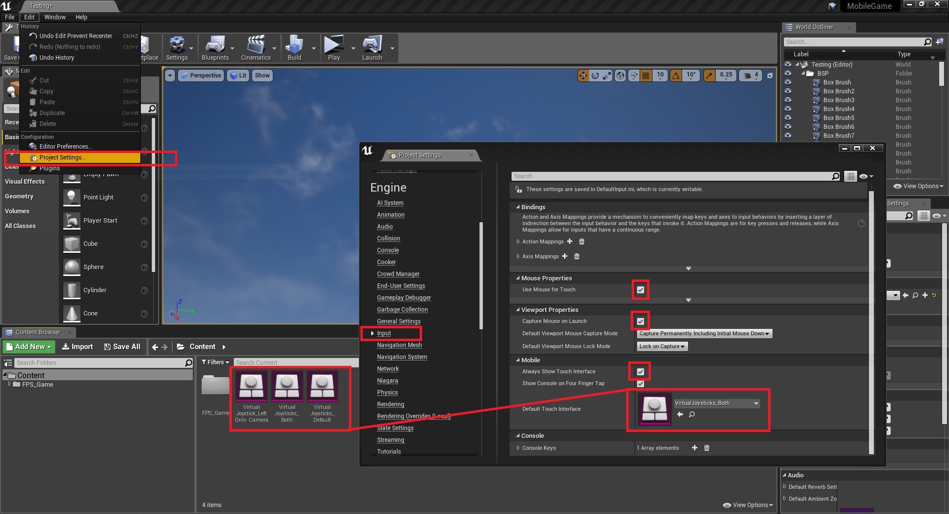 - Go to Project Settings > Input and enable”Always Show Touch Interface” and as the Virtual Joystick you can either use the default one from UE4 or create a new one with custom settings and image.