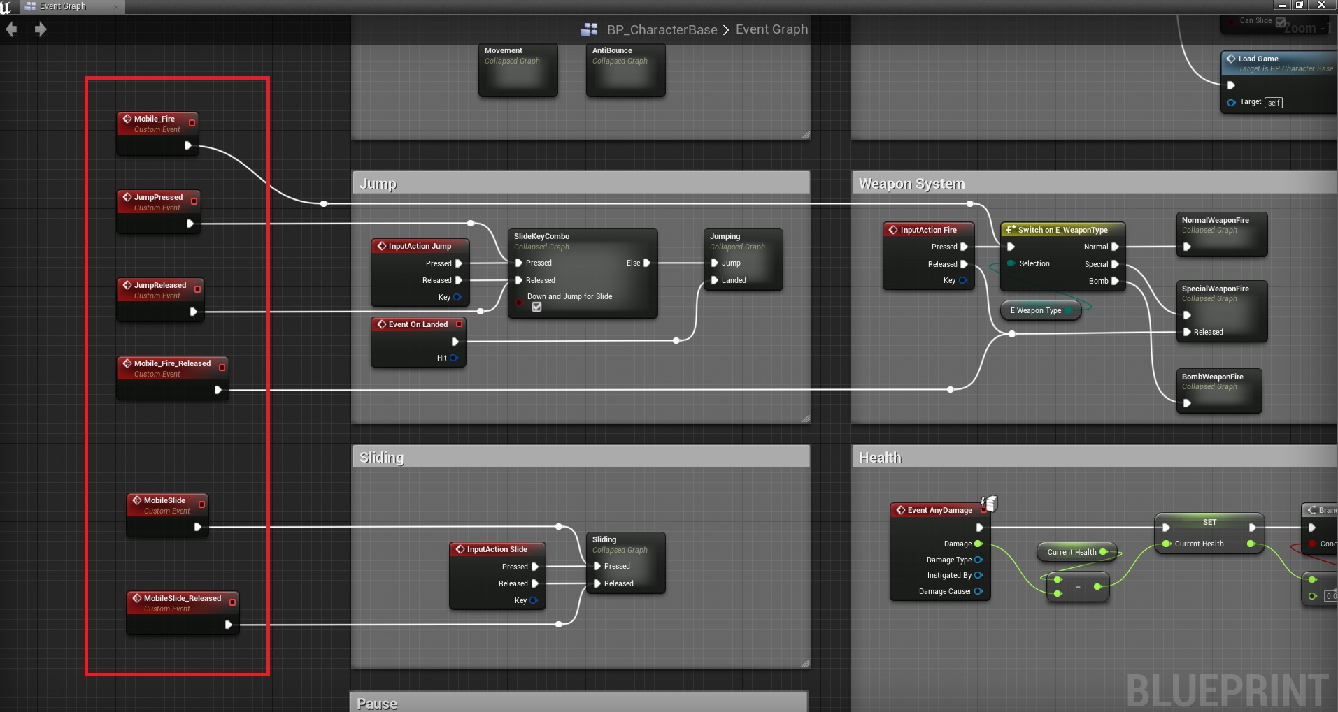 3. Open BP_CharacterBase and add Custom Events to whatever action you want the character to do on a mobile device. This is important because it’s the only way to call those events from a touch screen (without the use of external plugins or gestures).
