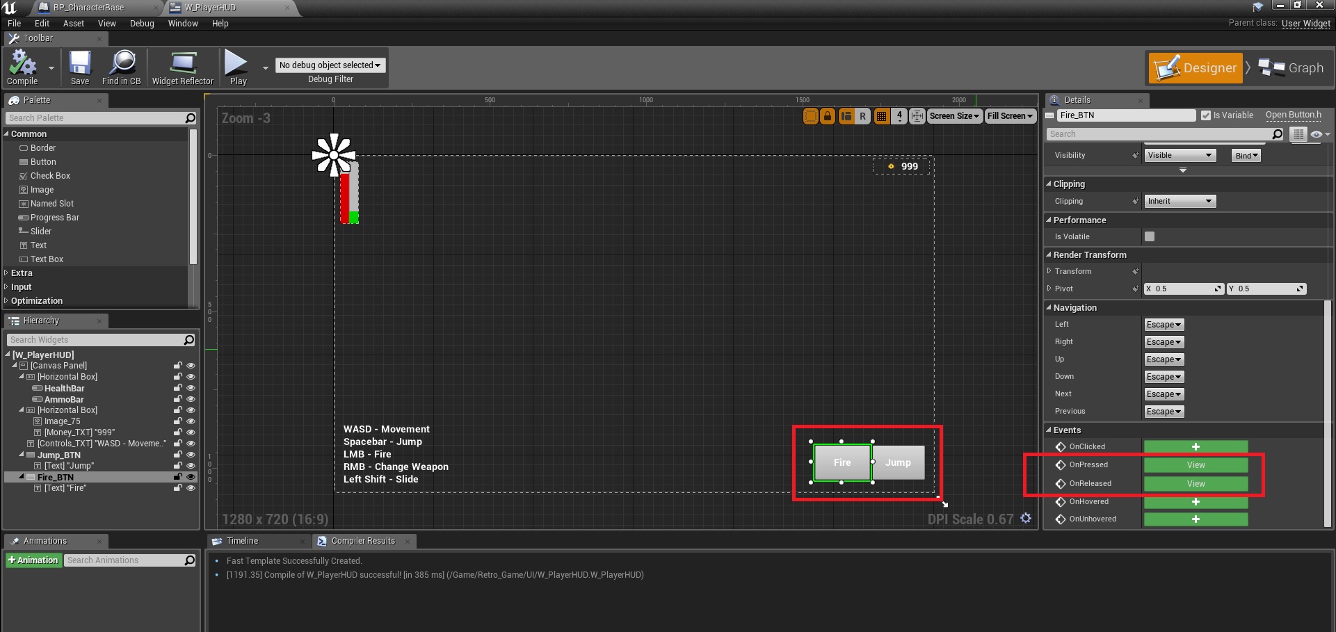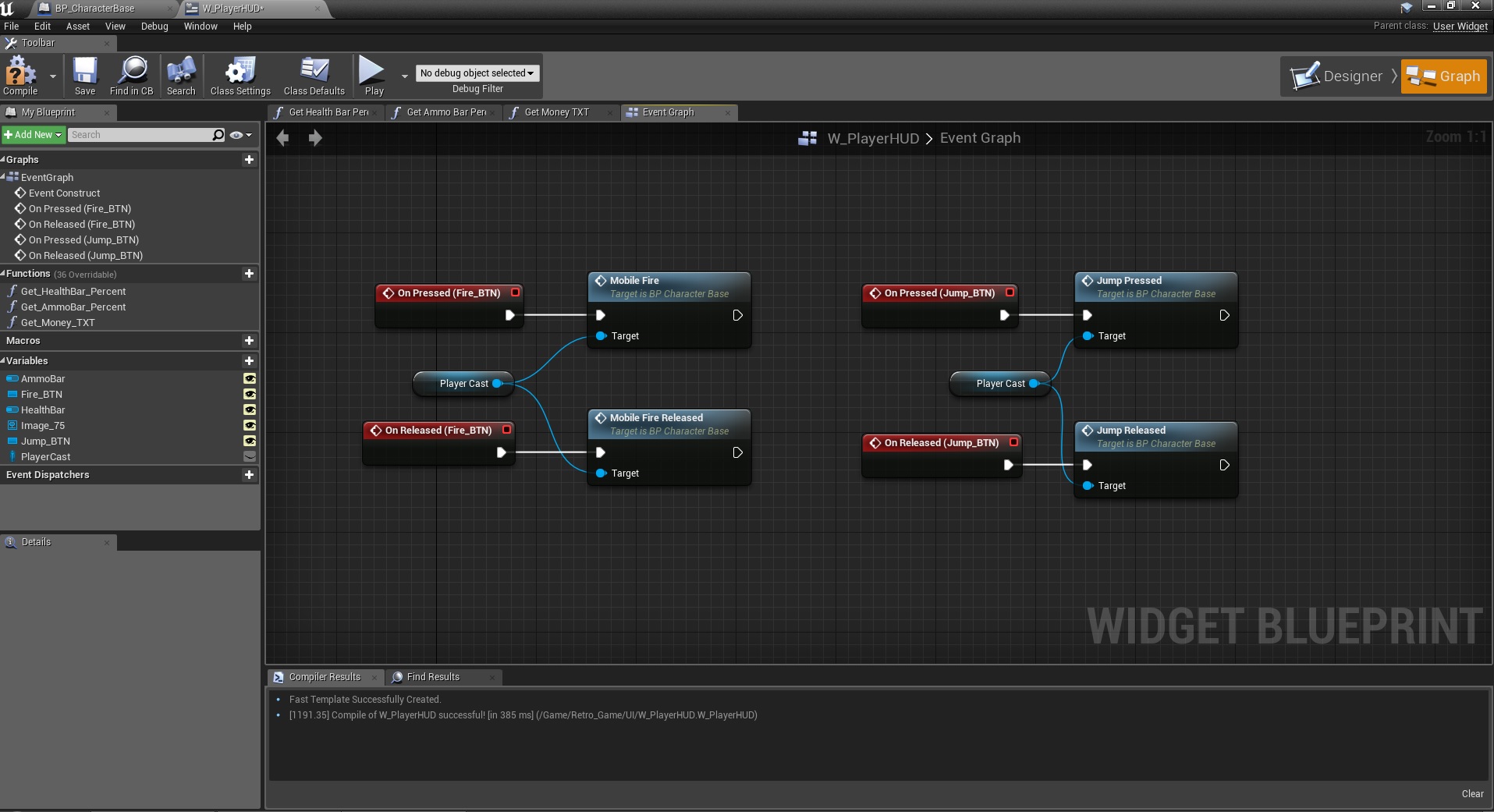 That’s it, when the game gets deployed on a mobile device, the buttons will be on screen and do the assigned actions. Basically the idea is to make a custom event on the character, a button on the widget, tell the button to call the event when pressed.