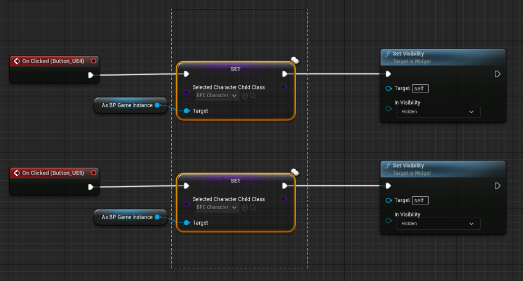 2. Open the W_SelectCharacter widget and add buttons to it that select any of the previously created character child classes and set the variable (like the included 2 examples)